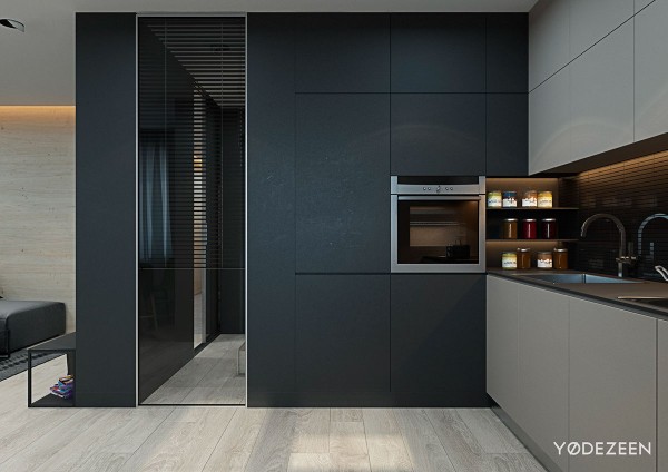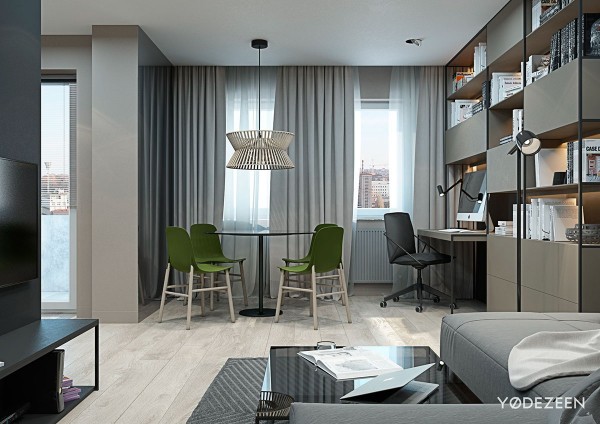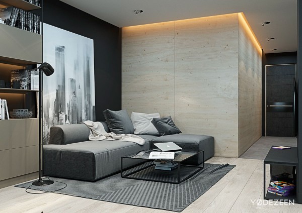 這間一室公寓采用現(xiàn)代單色主題搭配光滑的膠合板墻板。緊湊的客廳布置為整個(gè)家庭中的智能節(jié)省空間解決方案樹(shù)立了標(biāo)準(zhǔn)。