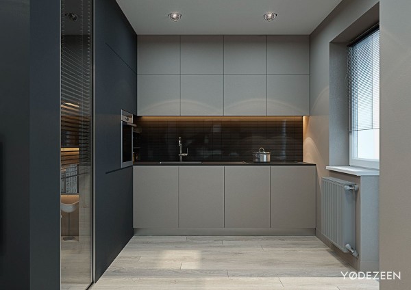 廚房非常簡(jiǎn)約。左側(cè)的啞光黑色鑲板讓中性櫥柜脫穎而出。