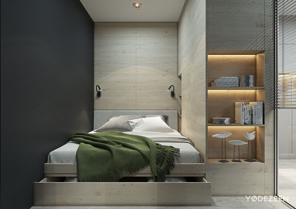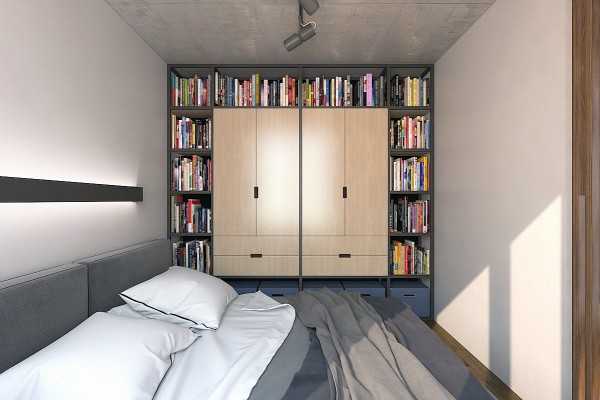 雖然初是一個(gè)真正的工作室布局,但設(shè)計(jì)師為臥室提供了自己的各種附件?;瑒?dòng)玻璃門(mén)可以提供充足的陽(yáng)光,儲(chǔ)物墻提供足夠的隱私。