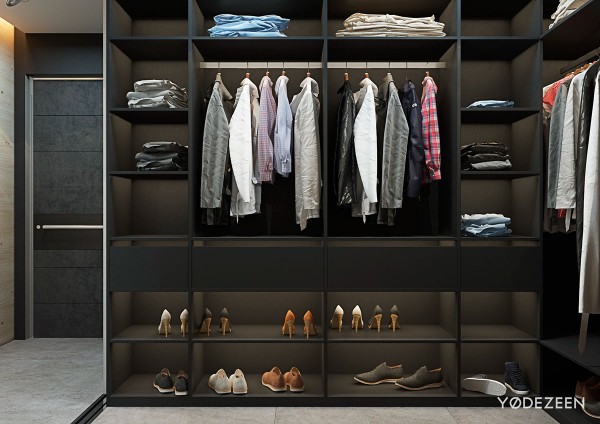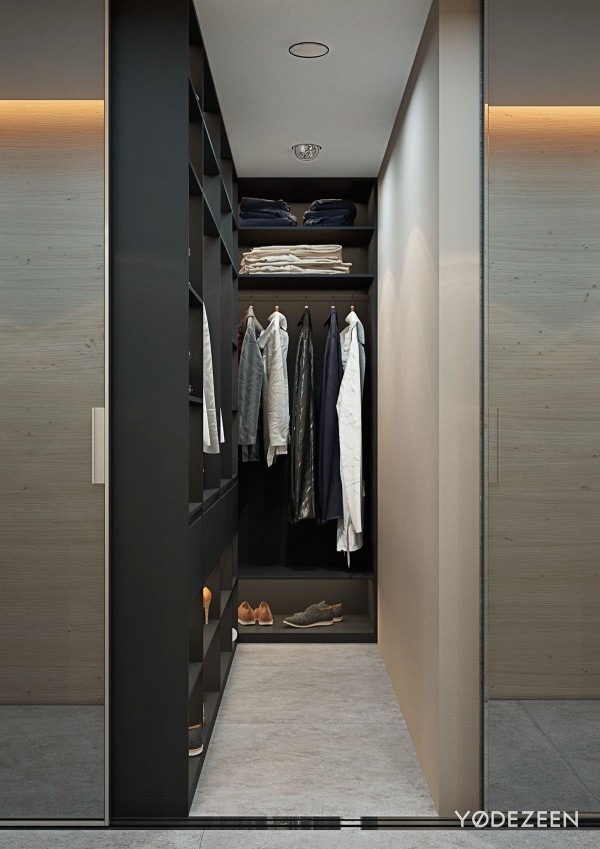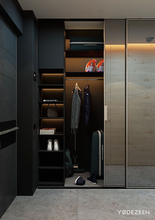 在入口附近,更多的滑動(dòng)鏡子隱藏了一個(gè)方便的衣帽間,里面有住戶出門(mén)所需的一切。間接照明使得即使在像這里這樣黑暗的空間中也可以找到任何物品。