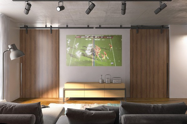 木板滑動(dòng)在一起以隱藏電視并暴露臥室和廚房——對(duì)于任何想要在工作室公寓布局中物理分隔房間的人來(lái)說(shuō),這是一個(gè)激動(dòng)人心的設(shè)計(jì)!