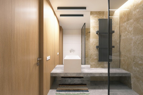 低調(diào)的水平瓷磚讓浴室感覺(jué)更寬敞,它們統(tǒng)一的布置引起了對(duì)天花板高度的關(guān)注——對(duì)于像這樣狹窄的浴室來(lái)說(shuō),這是一個(gè)明智的選擇。