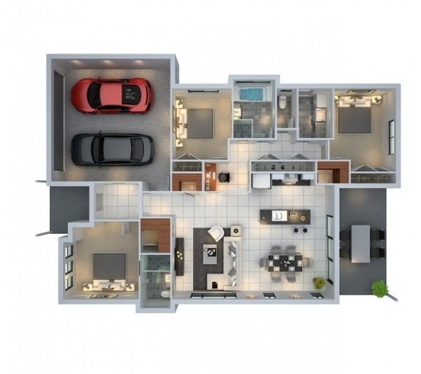仔細考慮將這個三臥室設計空間用于兩車位車庫以及室內和室外用餐區(qū)。
