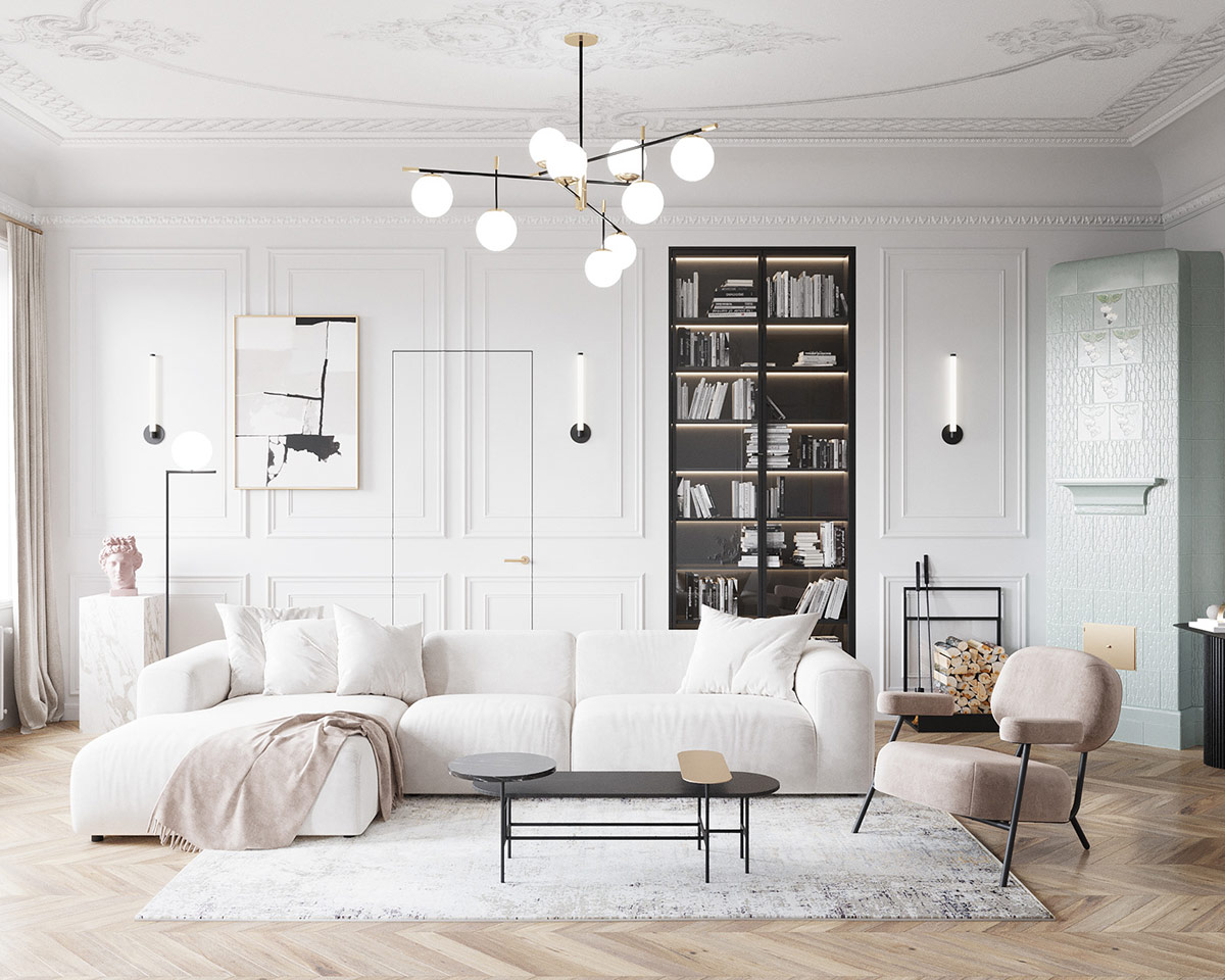 一個(gè)Maytoni懷舊 吊燈映入眼簾的,并提請(qǐng)注意一個(gè)美妙的原始裝飾粉刷天花板。相比之下,地板上的東西保持簡(jiǎn)單,有柔和的地毯和清爽的白色沙發(fā)。