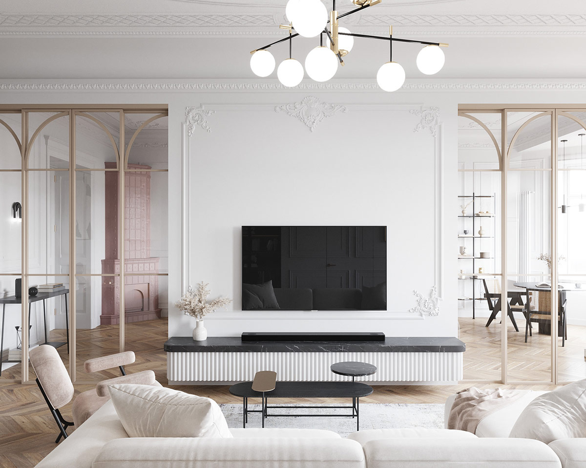 在沙發(fā)對(duì)面,一個(gè)漂浮的電視架在奢華的黑色大理石臺(tái)面下帶有時(shí)尚的羅紋美感。甲裝飾花瓶增加了一個(gè)小的高度的線(xiàn)性片,其與精美BOISERIE的框架連接它。電視墻兩側(cè)的玻璃門(mén)可以看到第二個(gè)休息區(qū),里面有一個(gè)漂亮的粉紅色壁爐。