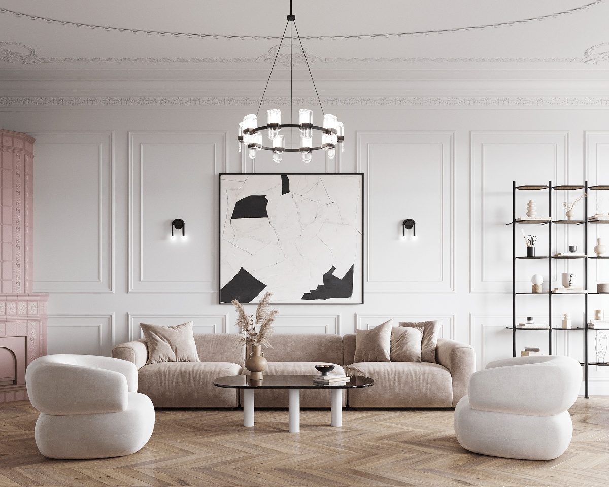 當(dāng)代藝術(shù)品在沙發(fā)上方、兩個(gè)時(shí)尚的黑色壁燈之間添加了大膽的黑白展示。