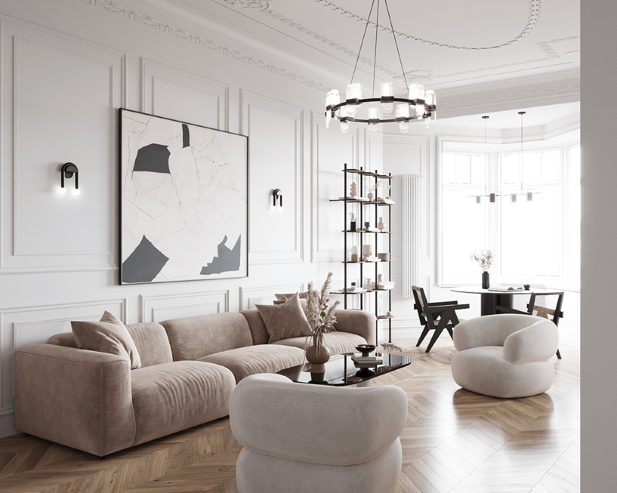 微妙的色調(diào)調(diào)色板打破了房間的崇高高度。周邊 LED 突出了經(jīng)典裝飾。