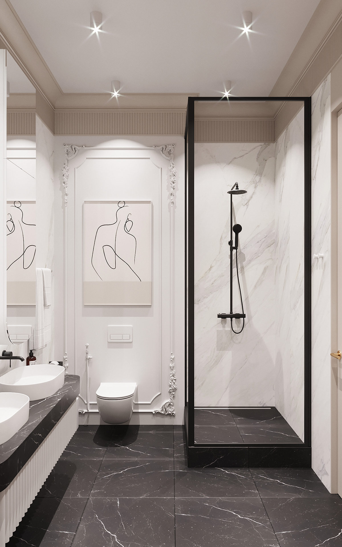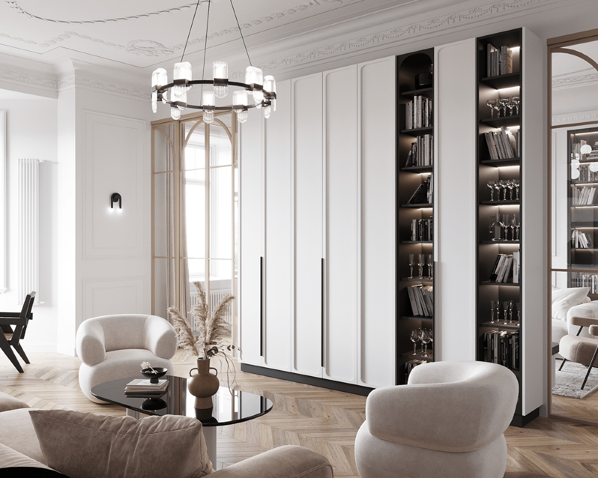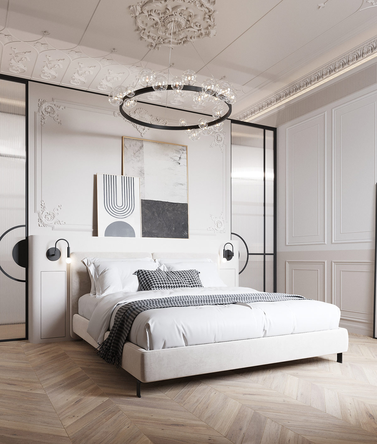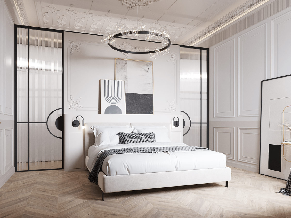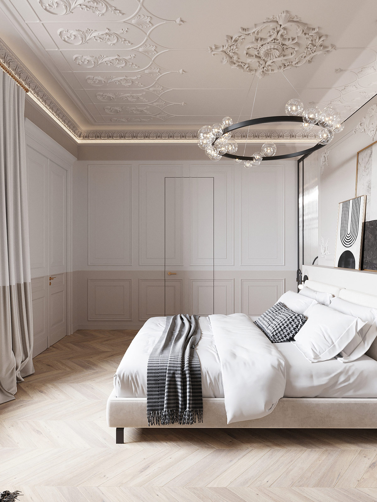 臥室是新古典主義室內(nèi)設(shè)計(jì)的一個(gè)壯觀例子,擁有迷人的裝飾灰泥天花板、經(jīng)典的皇冠造型和漂亮的床頭板墻。現(xiàn)代玻璃壁櫥門(mén)增加了令人難以置信的空間感、光線(xiàn)和宏偉感。