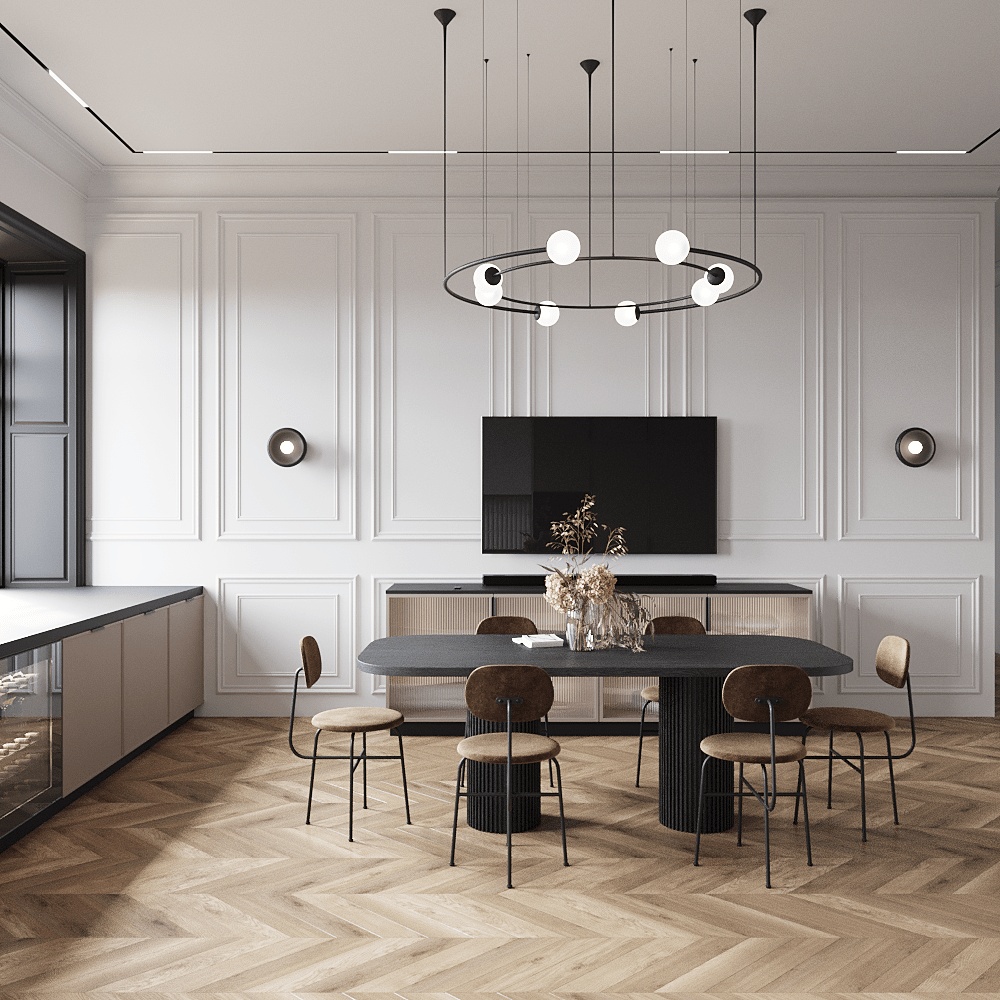 非凡的餐廳枝形吊燈在傳統(tǒng)壁板的背景下?tīng)I(yíng)造出現(xiàn)代感。