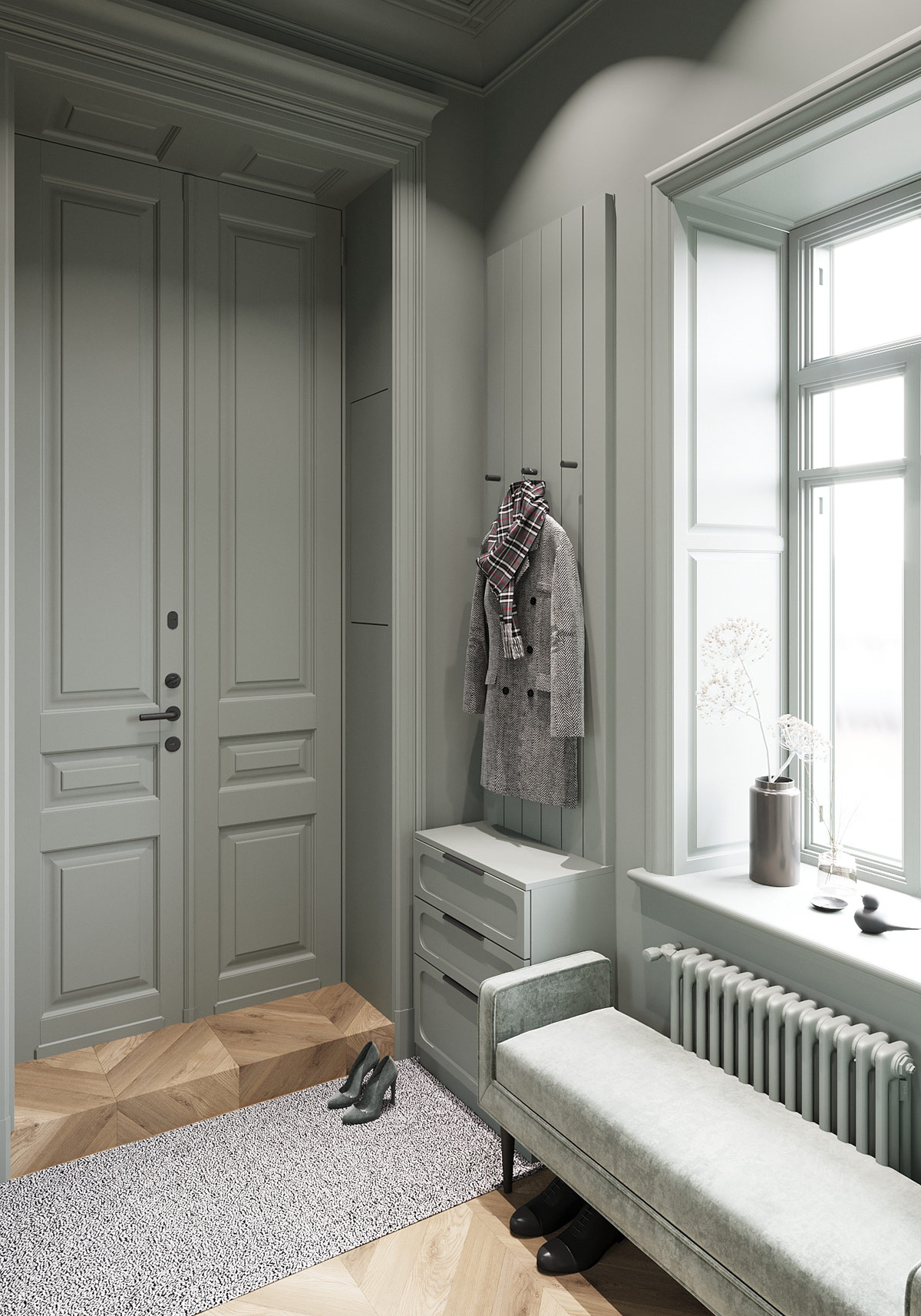 入口處是一片寧?kù)o的鼠尾草綠色海洋,墻壁、門(mén)、家具和散熱器的油漆都完美匹配。