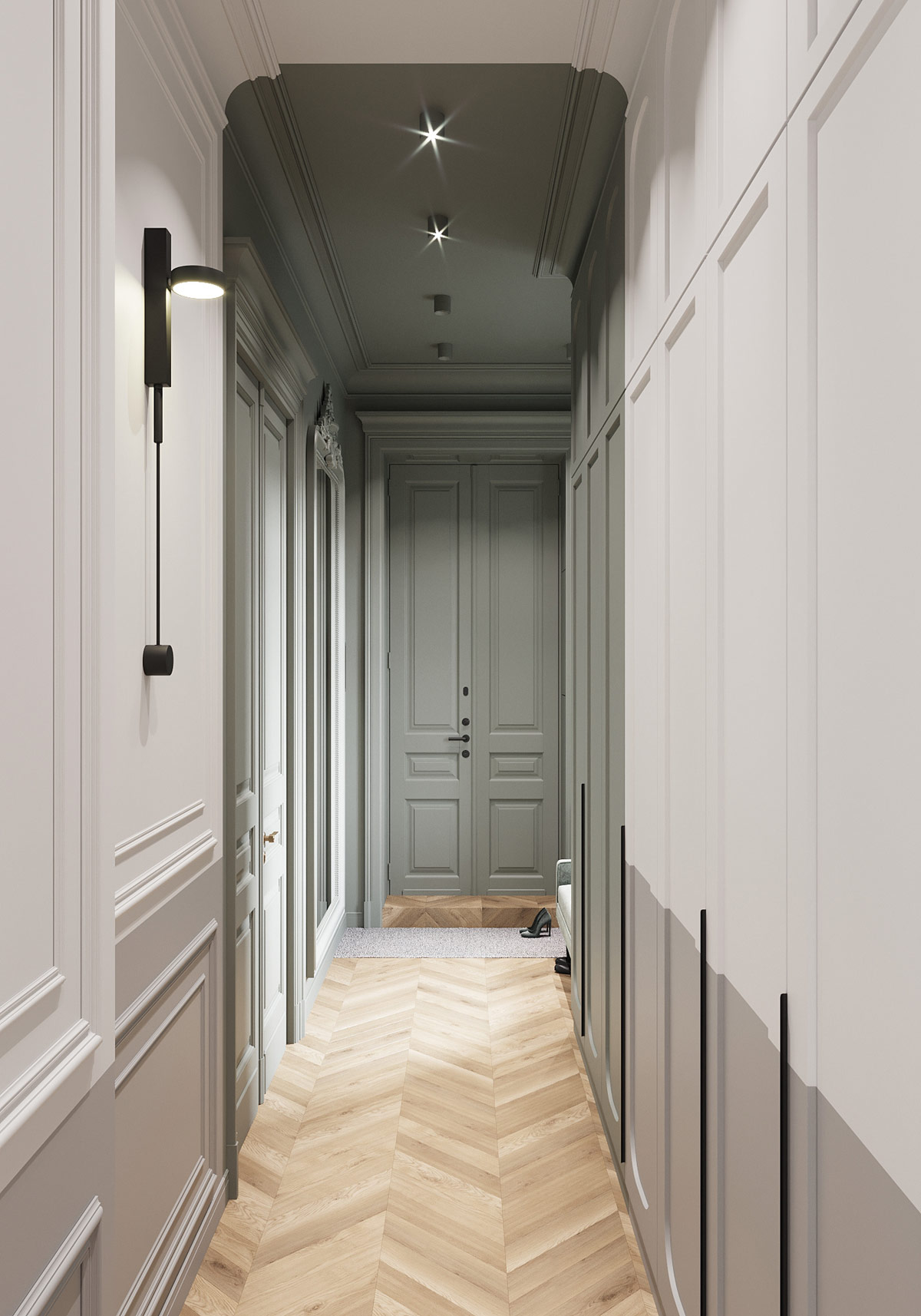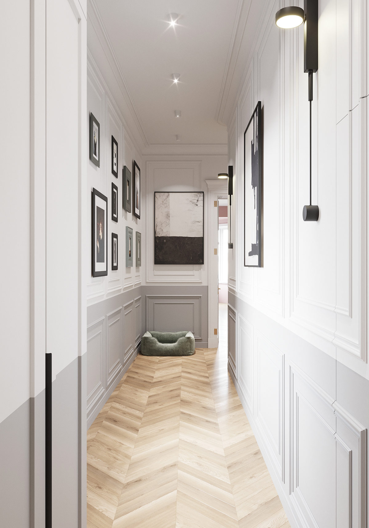 半高的淺灰色油漆效果將面板模壓墻和定制存儲(chǔ)單元切成兩半,以打破長(zhǎng)走廊的單調(diào)。