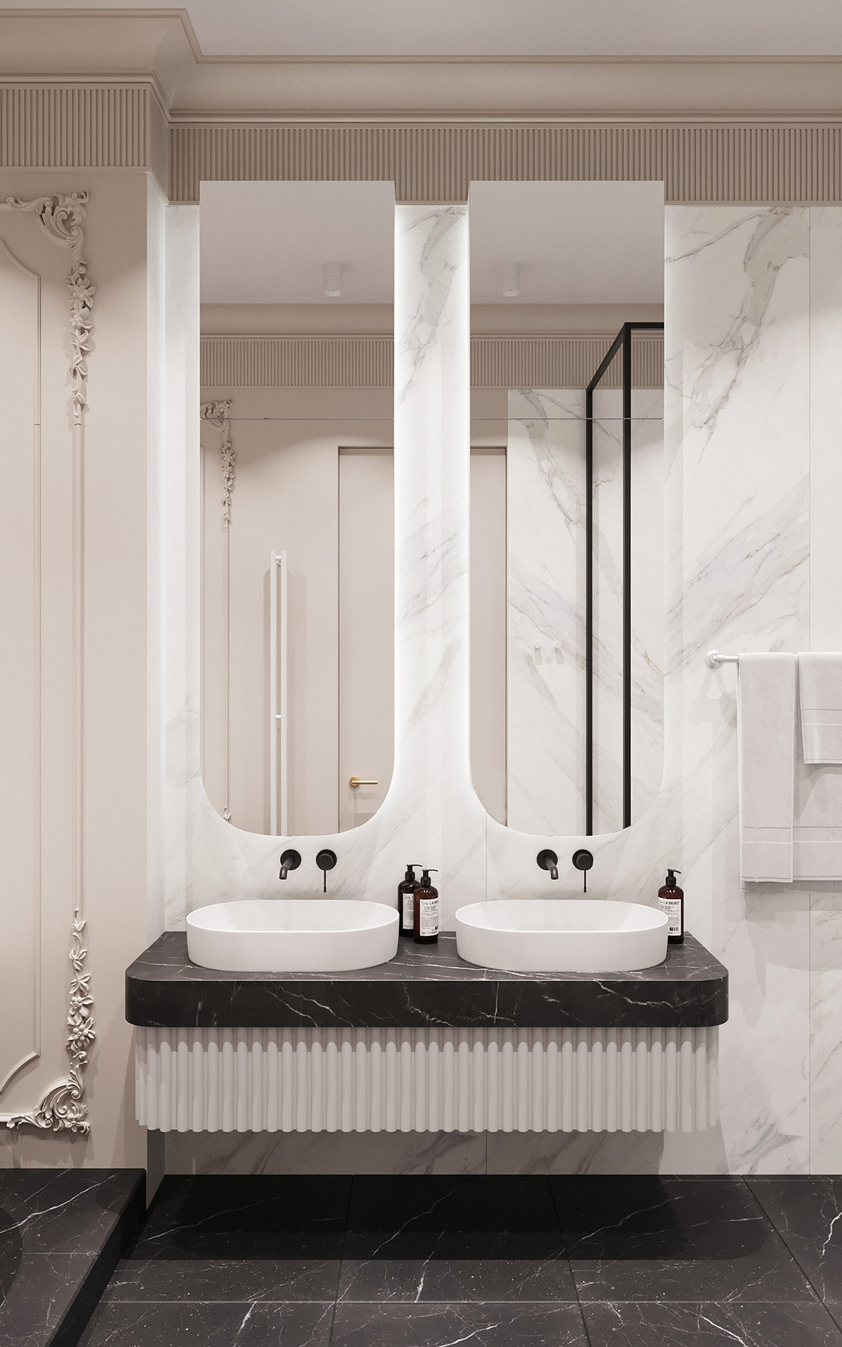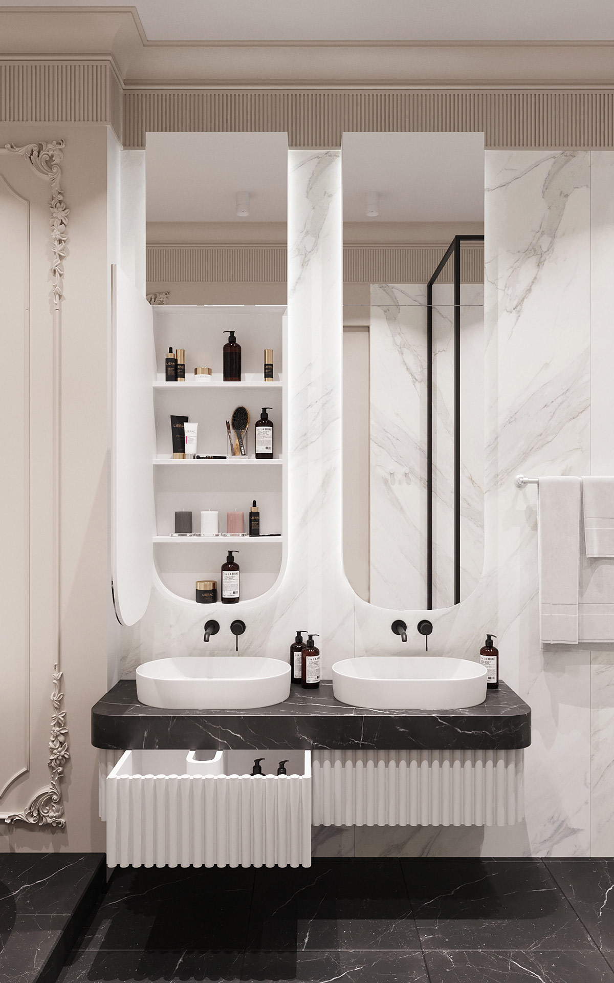 在主套間,雙水槽浴室梳妝臺(tái)采用與客廳電視柜相同的棱紋和黑色大理石美學(xué)。