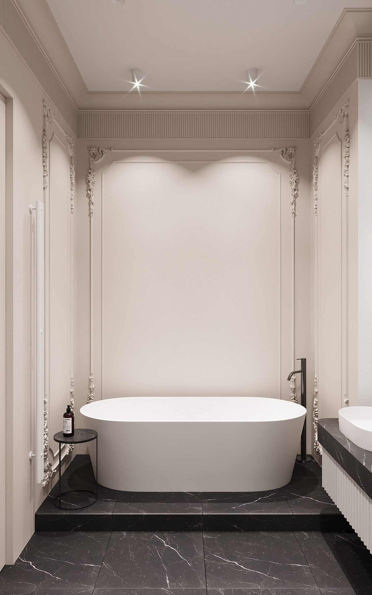 階梯式黑色大理石地板將浴缸抬高,以時(shí)尚的方式容納管道。一張黑色的小邊桌整齊地棲息在邊緣,