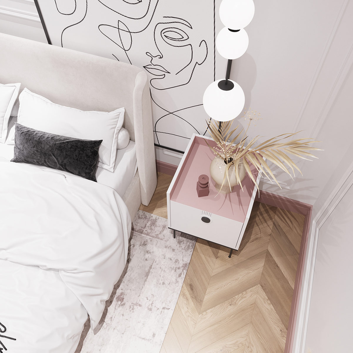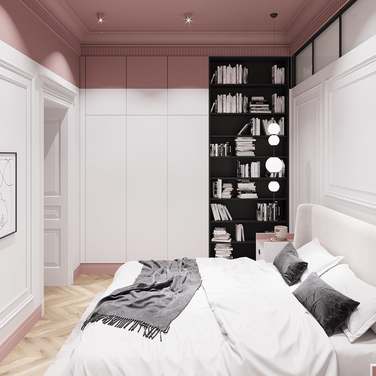 顏色協(xié)調(diào)的粉紅色踢腳板形成獨(dú)特的裝飾。