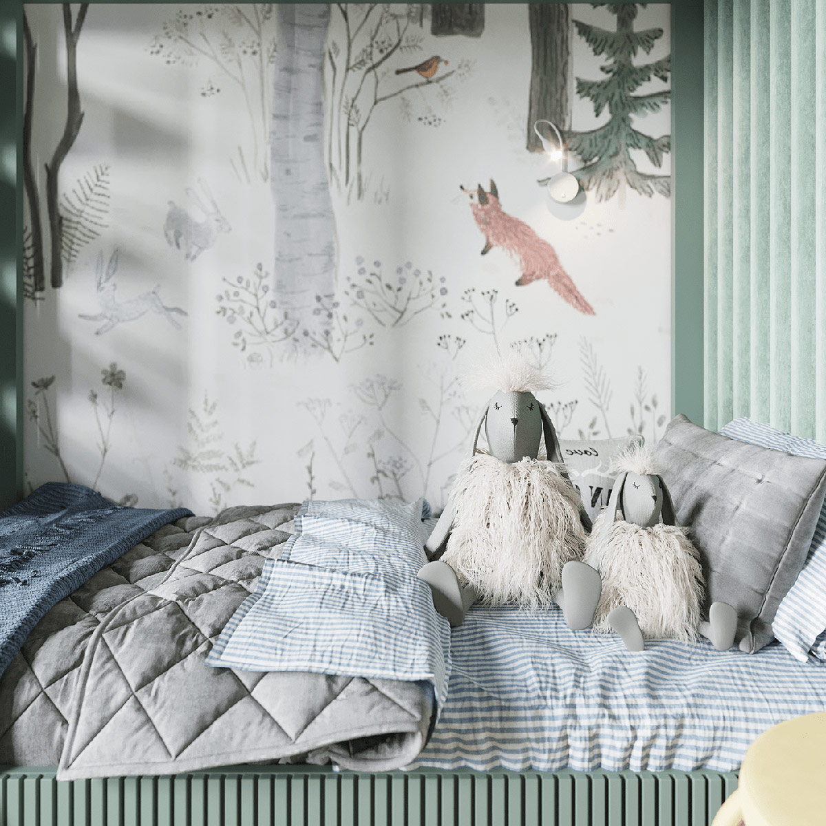 五顏六色的綠色、黃色、藍(lán)色和橙色裝飾,以及靈感源自大自然的壁畫(huà),讓這個(gè)空間充滿(mǎn)活力和趣味。