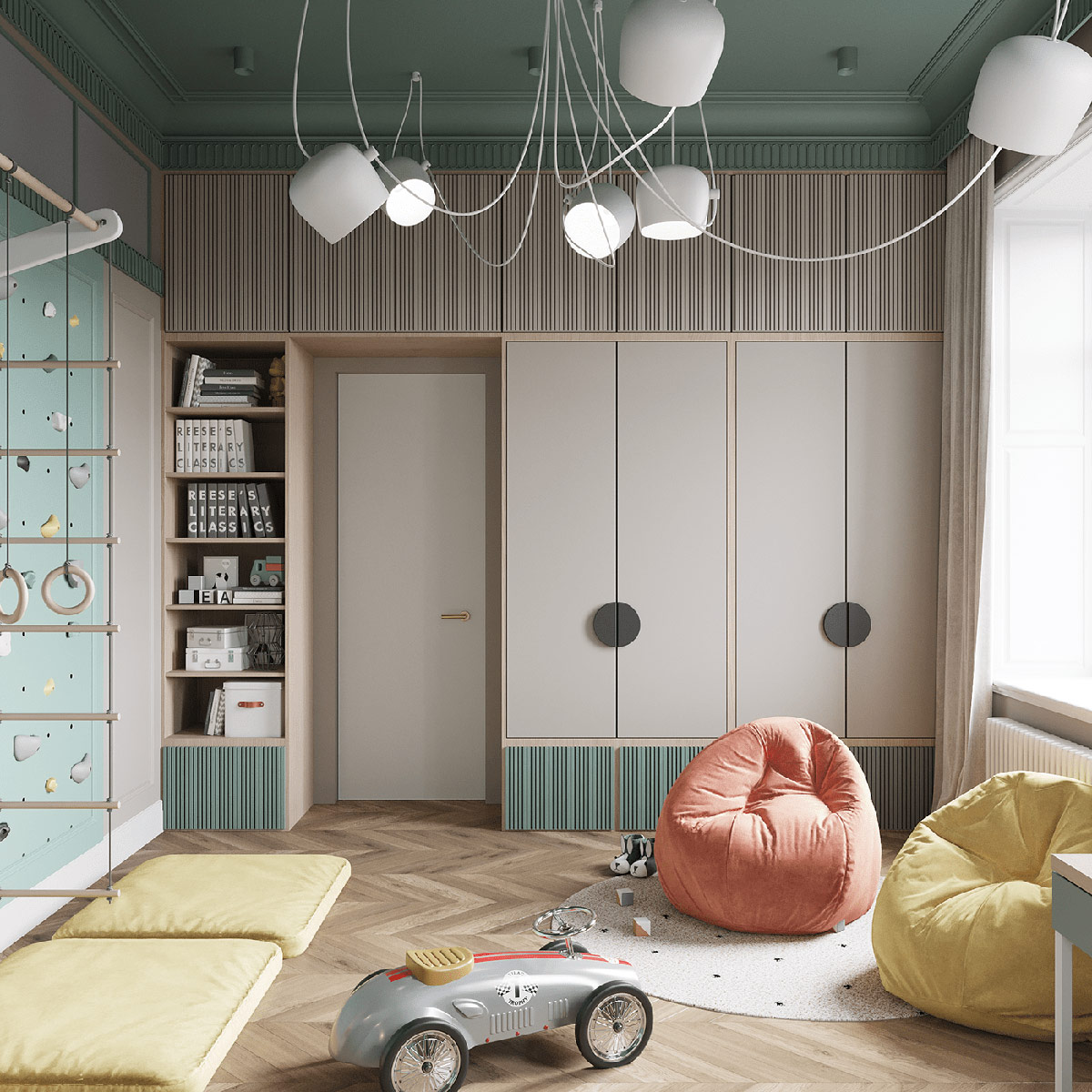 定制的壁柜、書(shū)架和衣柜內(nèi)置于門(mén)周?chē)?,打造出一個(gè)光滑的兒童儲(chǔ)物墻。