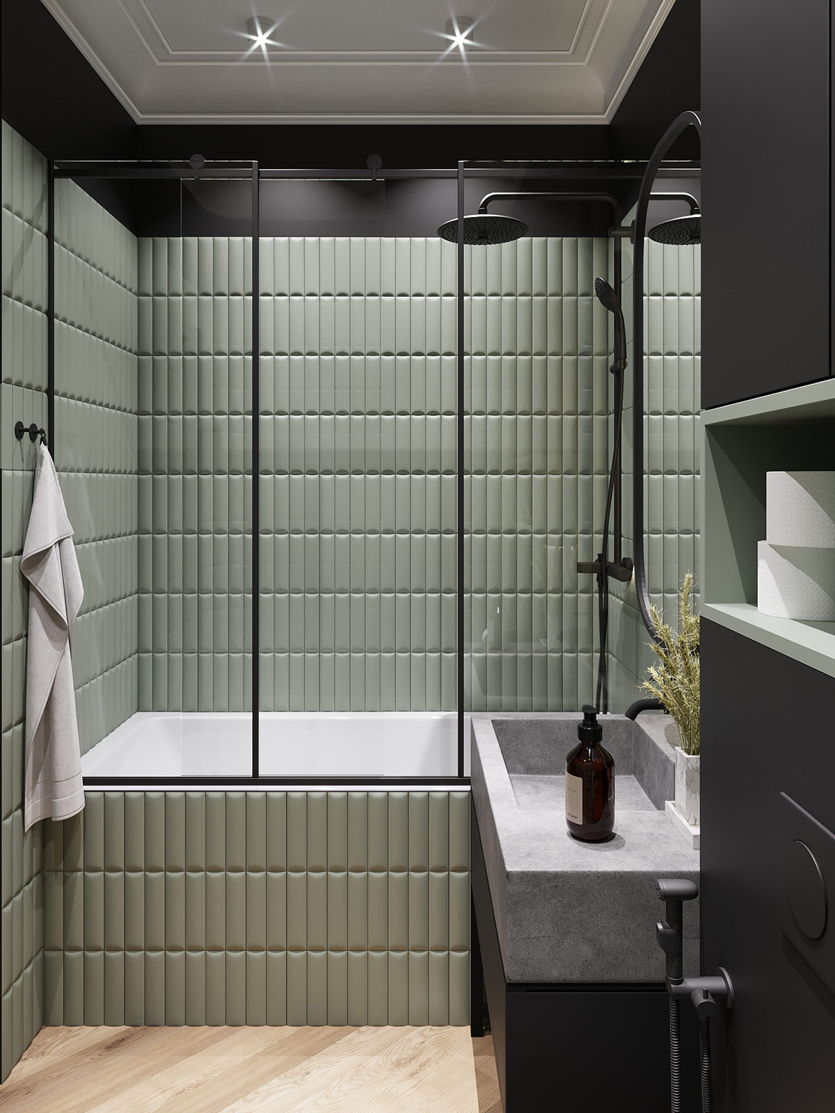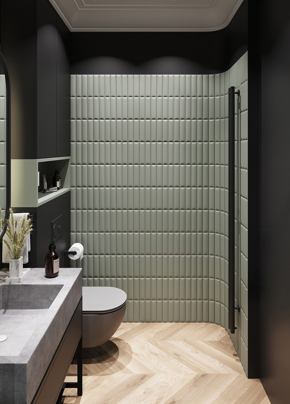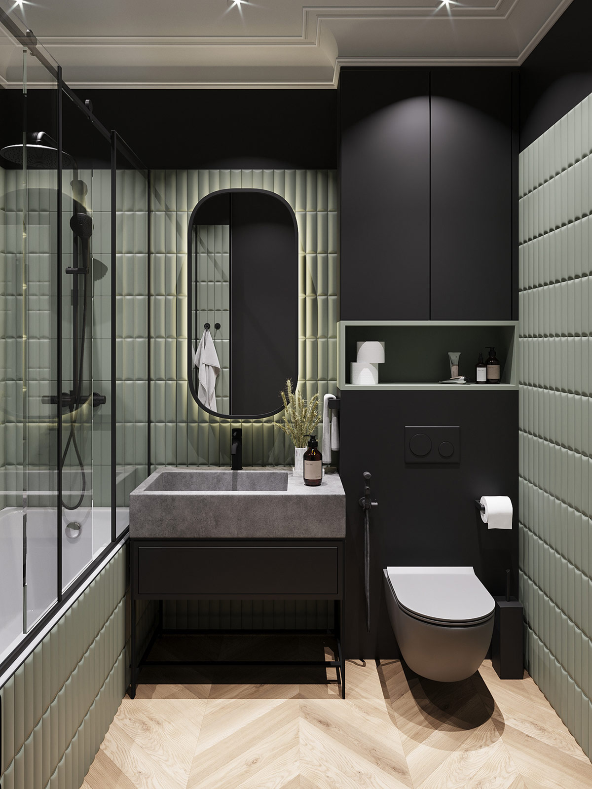 家庭浴室裝飾方案在黑色、灰色和綠色飽和色調(diào)下?tīng)I(yíng)造出戲劇性。