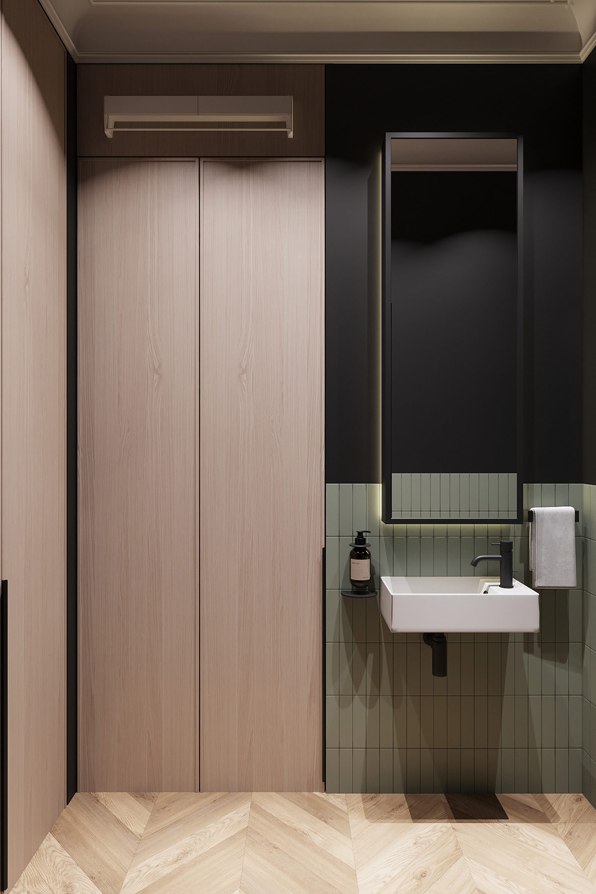 鼠尾草綠色入口油漆被淹沒(méi)并覆蓋在皇冠造型和天花板上,以創(chuàng)造清晰的分區(qū)。