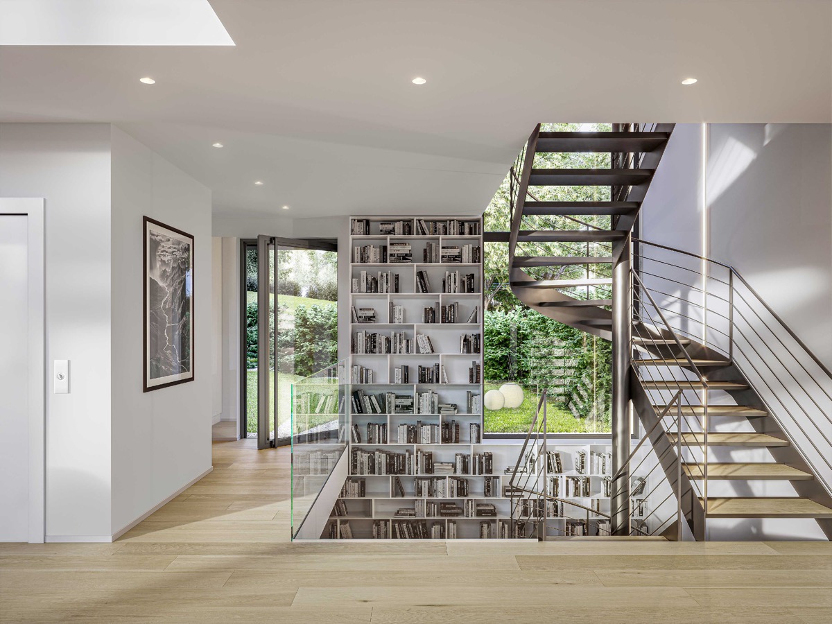 玻璃欄桿讓樓梯間書柜不受干擾,并且可以看到所有的榮耀。
