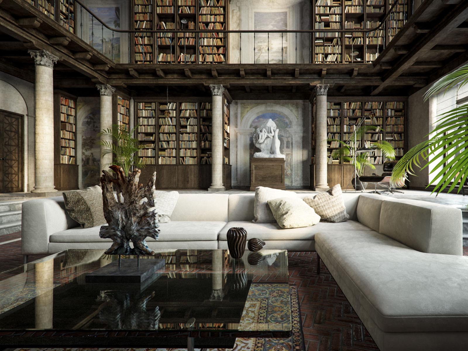 圍繞庭院彎曲書柜。在這里查看更多這個(gè)豪華地下掩體。