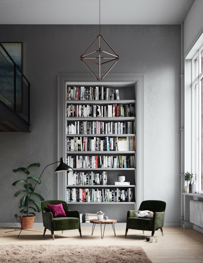 壁龕和壁龕為構(gòu)建精簡的圖書館提供了機(jī)會(huì)。用寬大的裝飾造型框出凹槽,打造高端定制外觀。在前面放置一對漂亮的躺椅和時(shí)尚的落地?zé)簦酝瓿烧w。