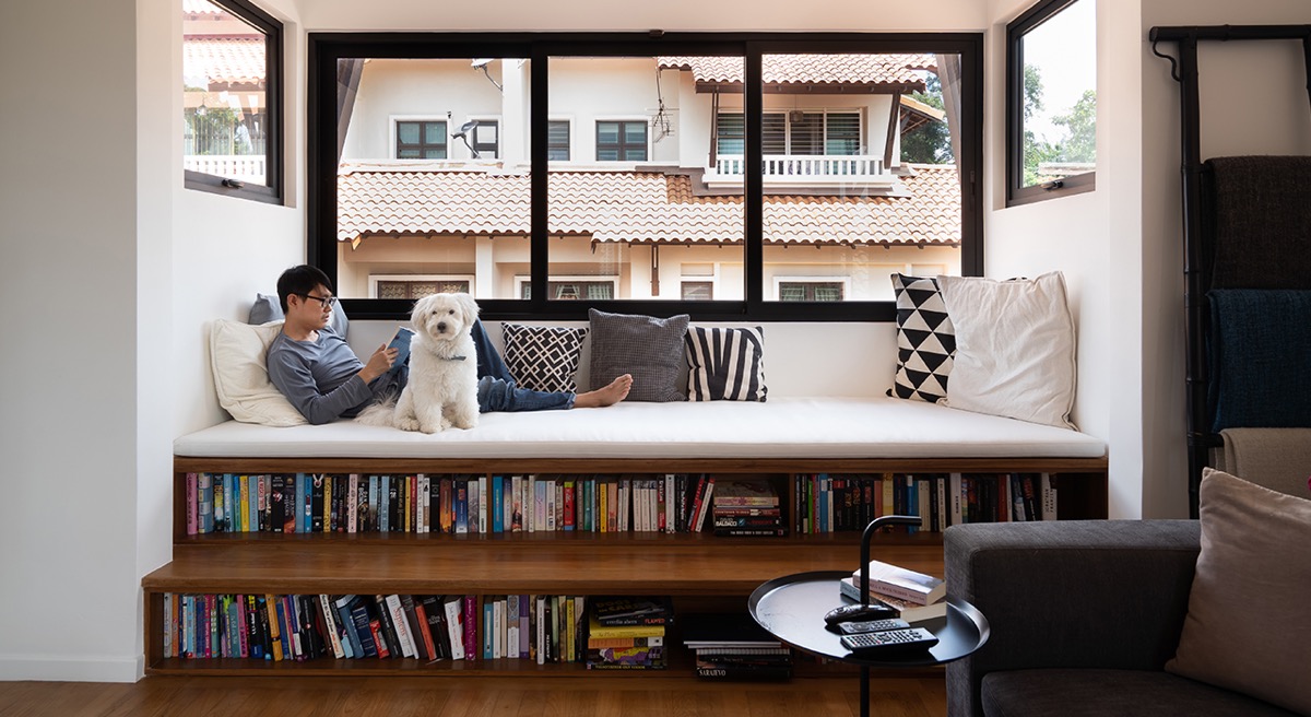 混合、匹配和模塊化。將帶有高架擱板和組合座椅的扁平書柜連接起來,打造一個(gè)經(jīng)濟(jì)高效的窗戶閱讀角。