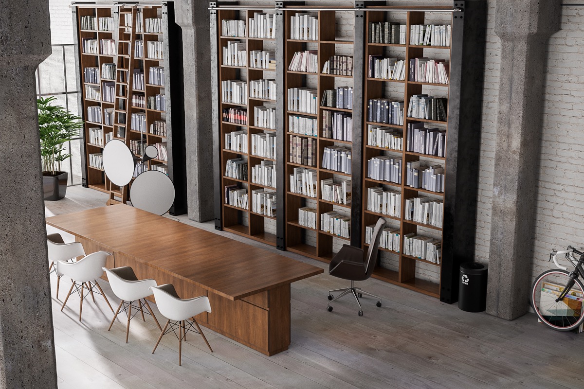 工業(yè)風(fēng)格的環(huán)境與木制書柜和成簇的文學(xué)作品的溫暖形成了涼爽的對比。