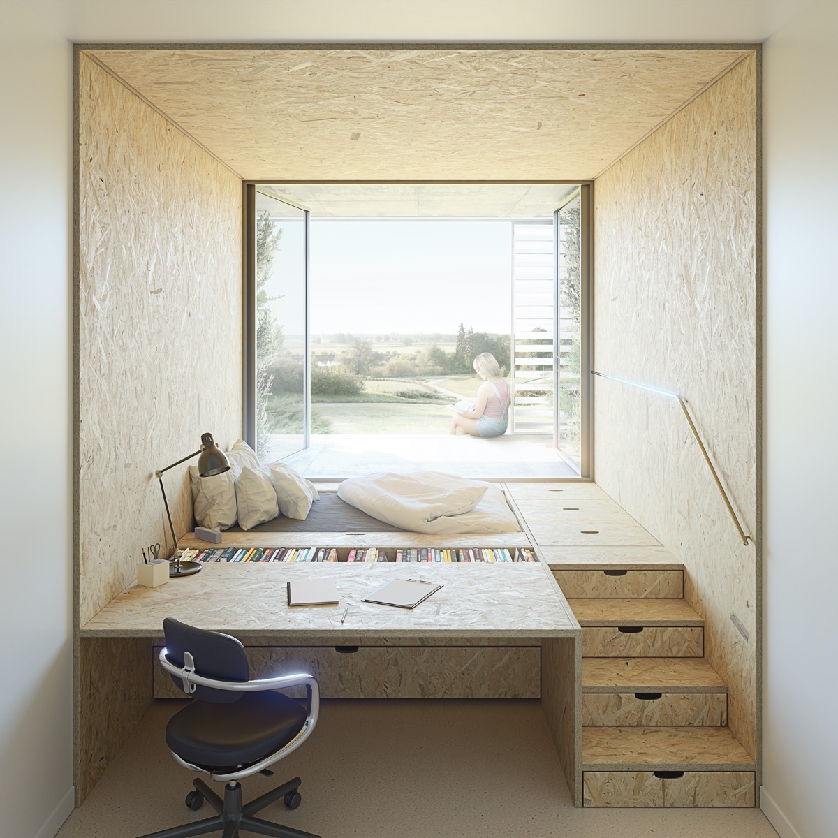 預(yù)算有限的情人?OSB 刨花板為創(chuàng)建定制家具提供了一個(gè)非常便宜的選擇,比如這個(gè)融合了臥室和書房的區(qū)域,帶有一個(gè)小儲(chǔ)物樓梯,以及一個(gè)放在桌子上的迷你圖書館。