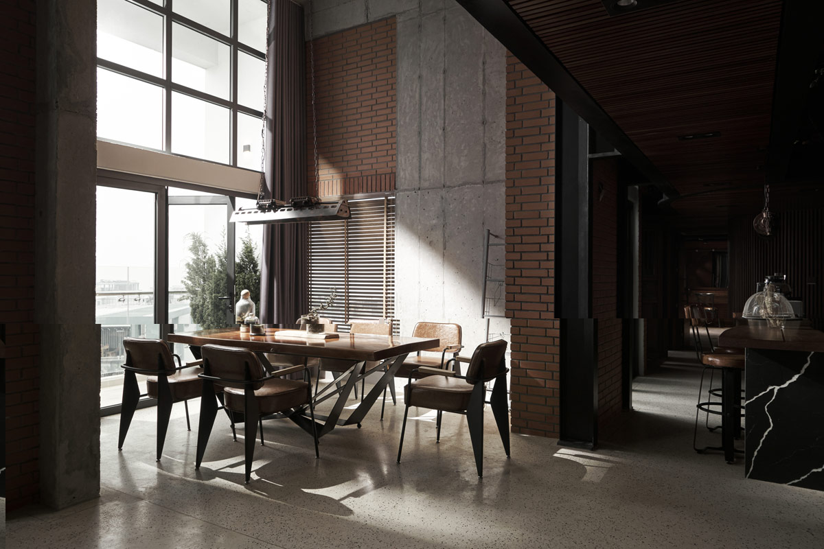 原始混凝土和紅磚在餐廳墻壁周圍形成對比。