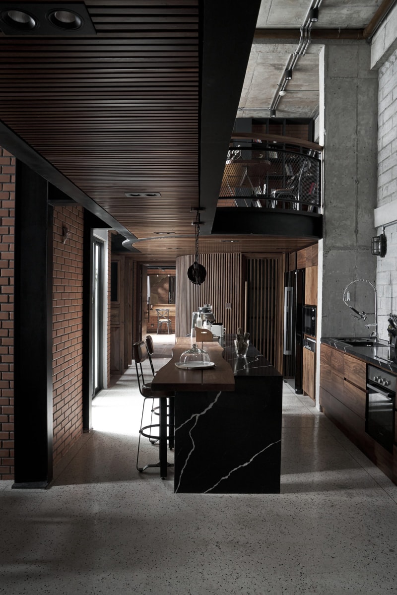 夾層走道降低了整個廚房的天花板高度,聚光燈隱藏在豐富的木飾面中。