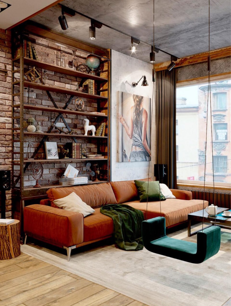 我們的第二個工業(yè)內(nèi)飾以古怪、多彩的裝飾為特色,就像休息室里這把獨(dú)特的綠色秋千椅。