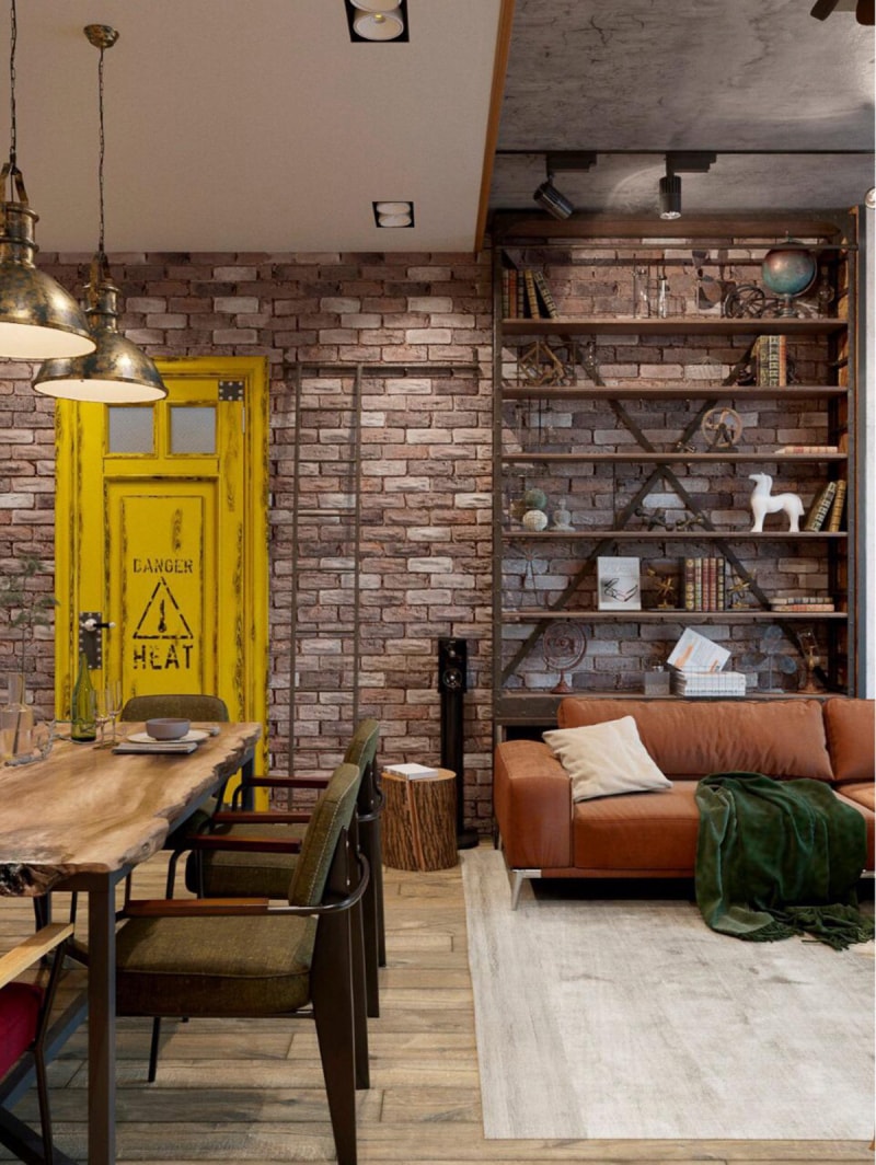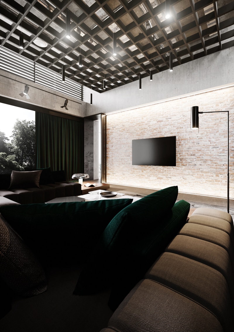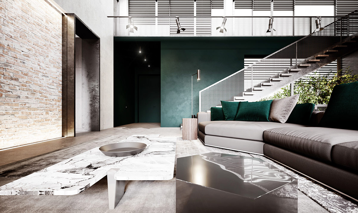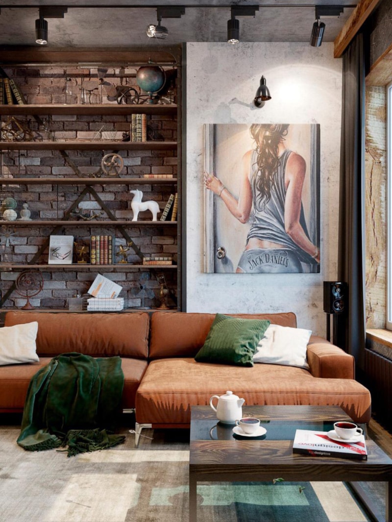 綠色散落的靠墊和相配的地毯與赤褐色沙發(fā)內(nèi)飾形成鮮明對比。黑色的工業(yè)壁燈照亮了藝術(shù)品和原始的混凝土背景。裸露的磚墻支撐著書架。