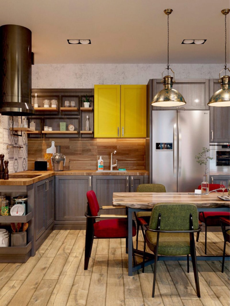 明亮的黃色壁柜喚醒了灰色的L 形廚房。