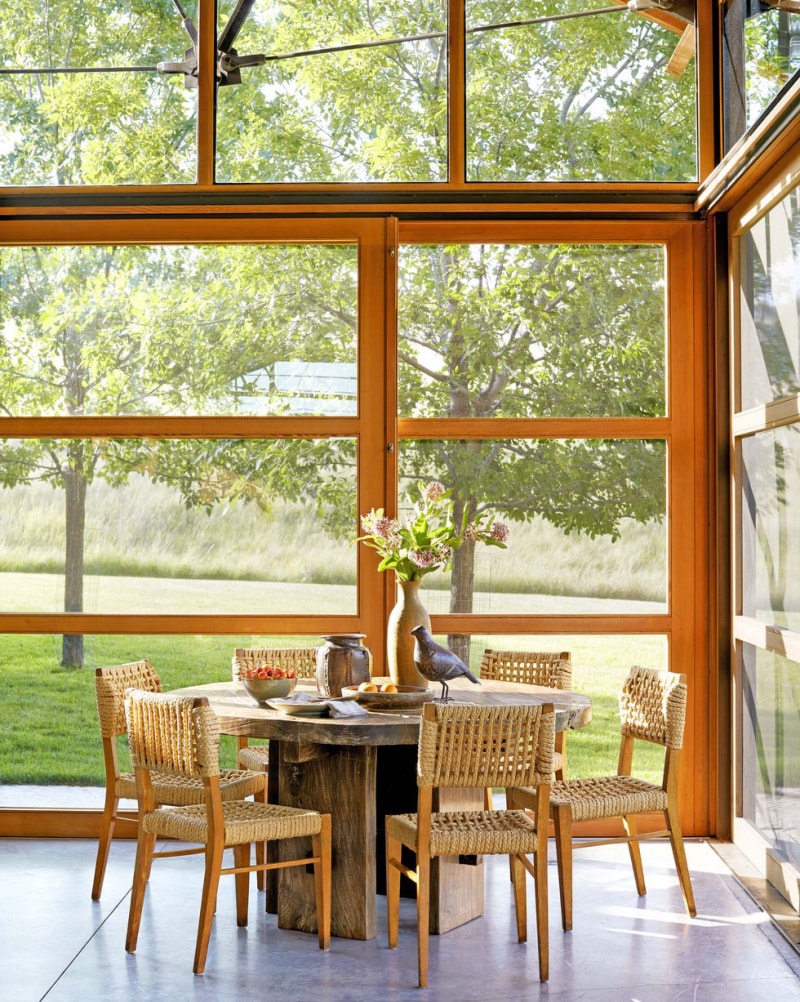用雙折窗將您的餐桌打開到戶外。在兩側(cè)擴展一張桌子,就像在這個房間里一樣,或者簡單地在露臺旁添加一張桌子以簡化設施。