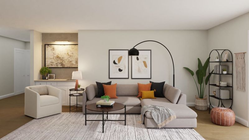 這間現(xiàn)代質(zhì)樸的客廳采用中性色調(diào),配有終端沙發(fā),深座椅和豪華誘人的室內(nèi)裝潢為整個(gè)房間帶來精致。為了增添色彩,搭配了黃色、黑色和橙色的重點(diǎn)枕頭。