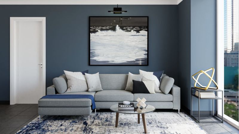 這個(gè)現(xiàn)代客廳充滿了灰色調(diào),中性色調(diào)的部分非常漂亮。左側(cè)組合沙發(fā)位于大窗戶的右側(cè),可提供獨(dú)特的景觀。白色、藍(lán)色和黑色的重點(diǎn)枕頭,為組合增添了美麗的色彩。