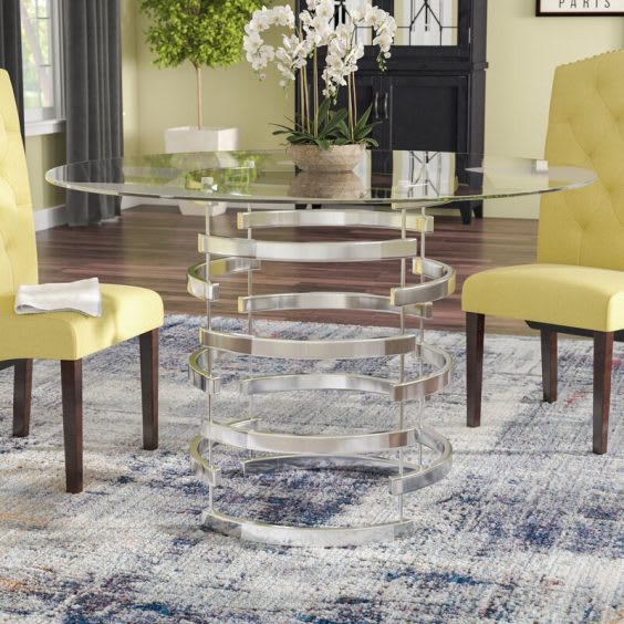 這張玻璃餐桌值得一看。用這件令人驚嘆的作品為你的餐廳帶來(lái)華麗的升級(jí)。這款玻璃桌面圓形餐桌采用開(kāi)放式設(shè)計(jì),圓柱形底座,鍍鉻飾面。透明的玻璃臺(tái)面賦予它時(shí)尚、現(xiàn)代的外觀,既輕松又別致。