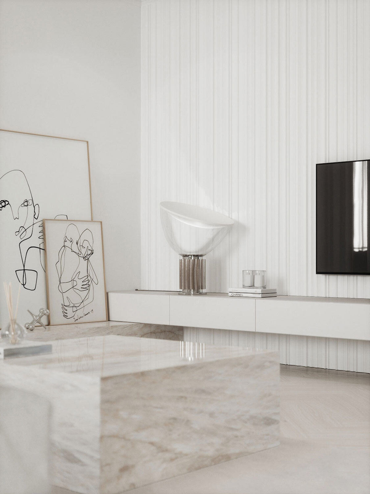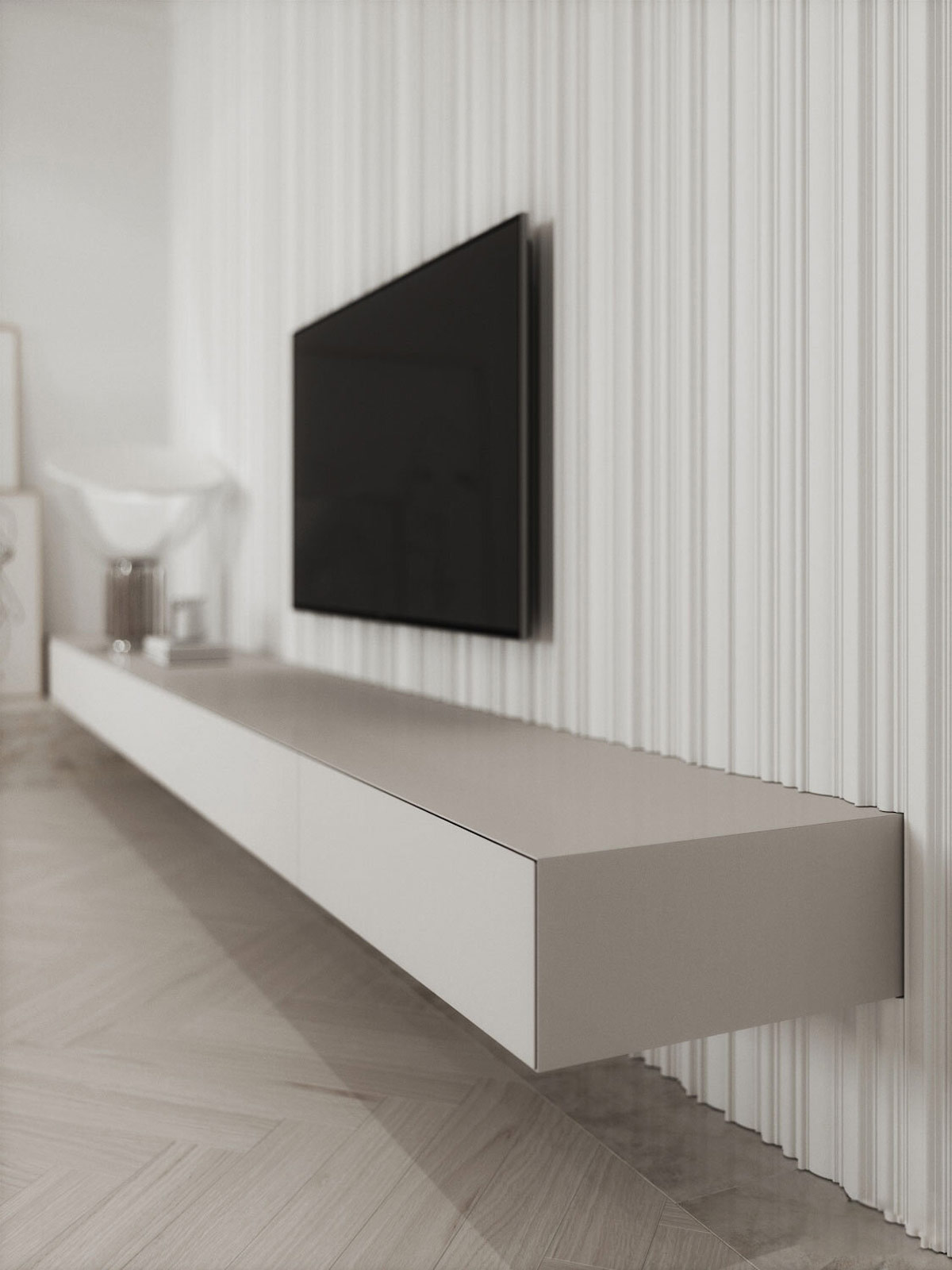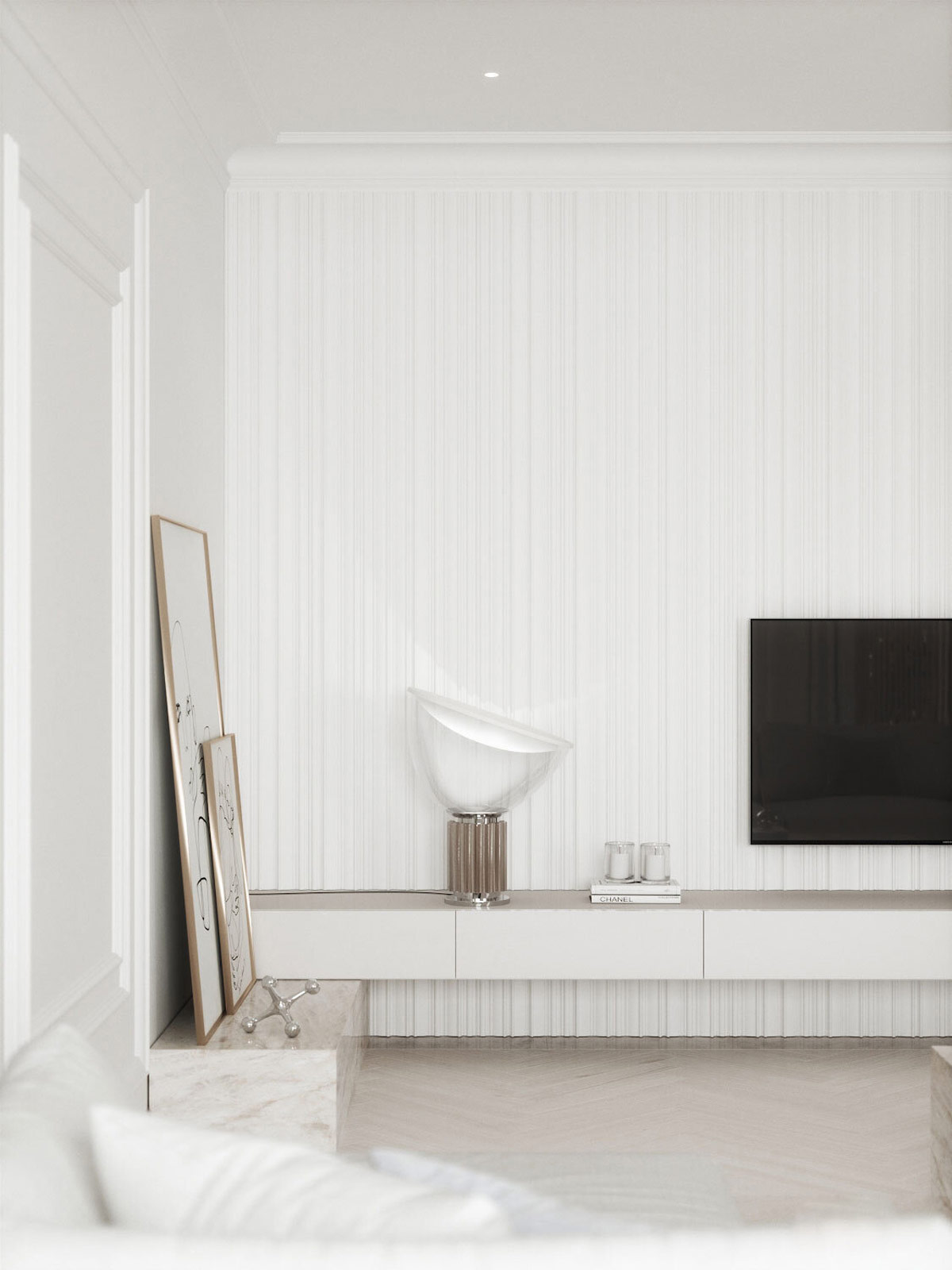 一個(gè)設(shè)計(jì)師臺燈增加了大氣向上照明到電視墻,突出凹槽石膏鑲板墻。