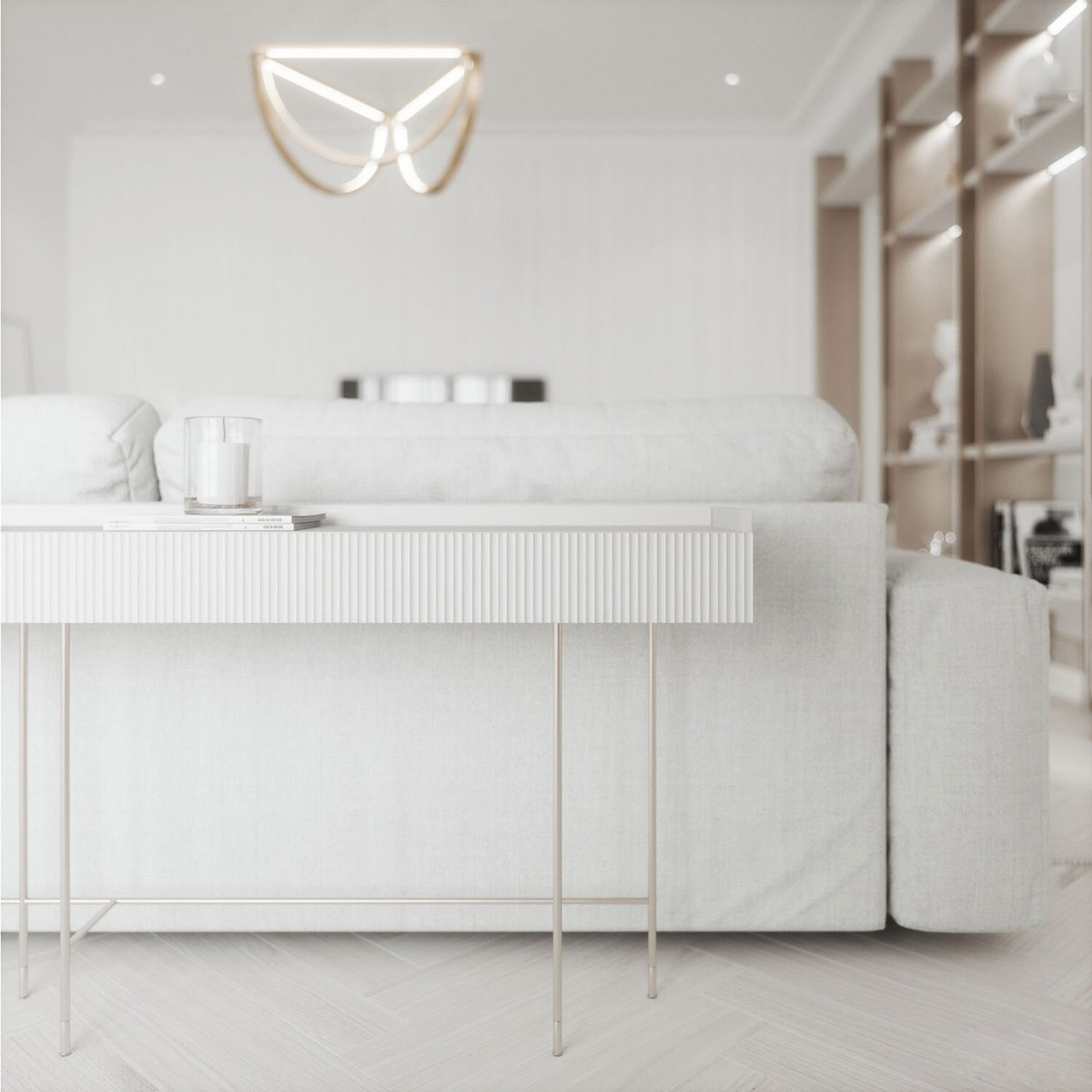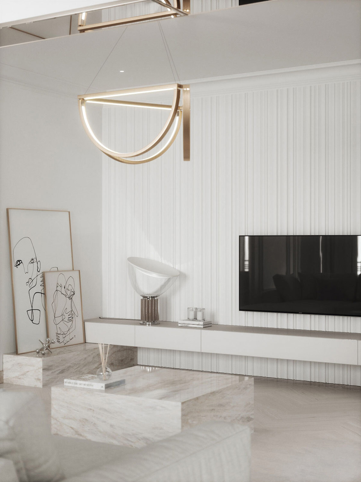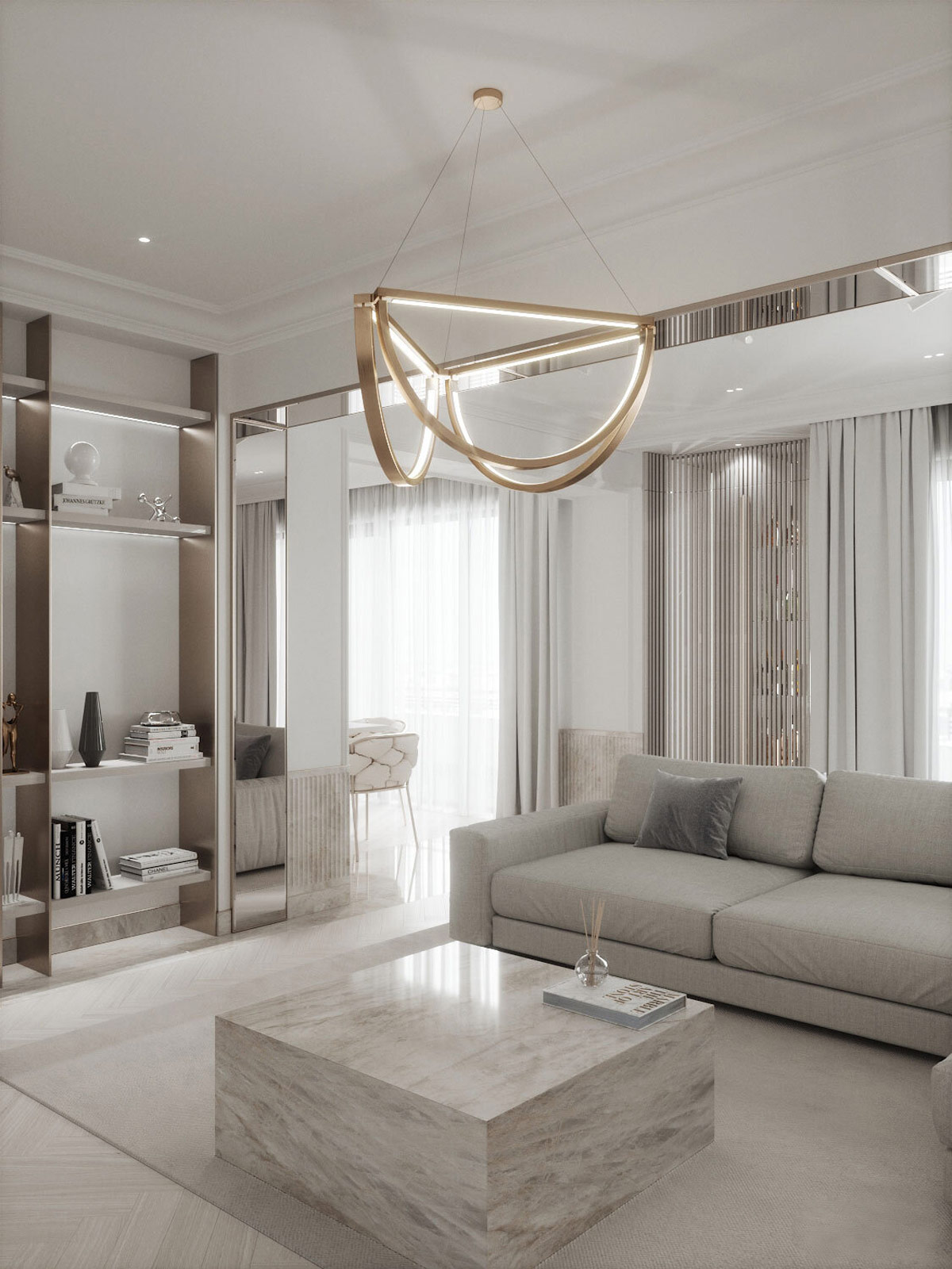 三個(gè)倒拱形在白色客廳上方形成了一個(gè)獨(dú)特的現(xiàn)代吊燈,增添了香檳金的光澤。