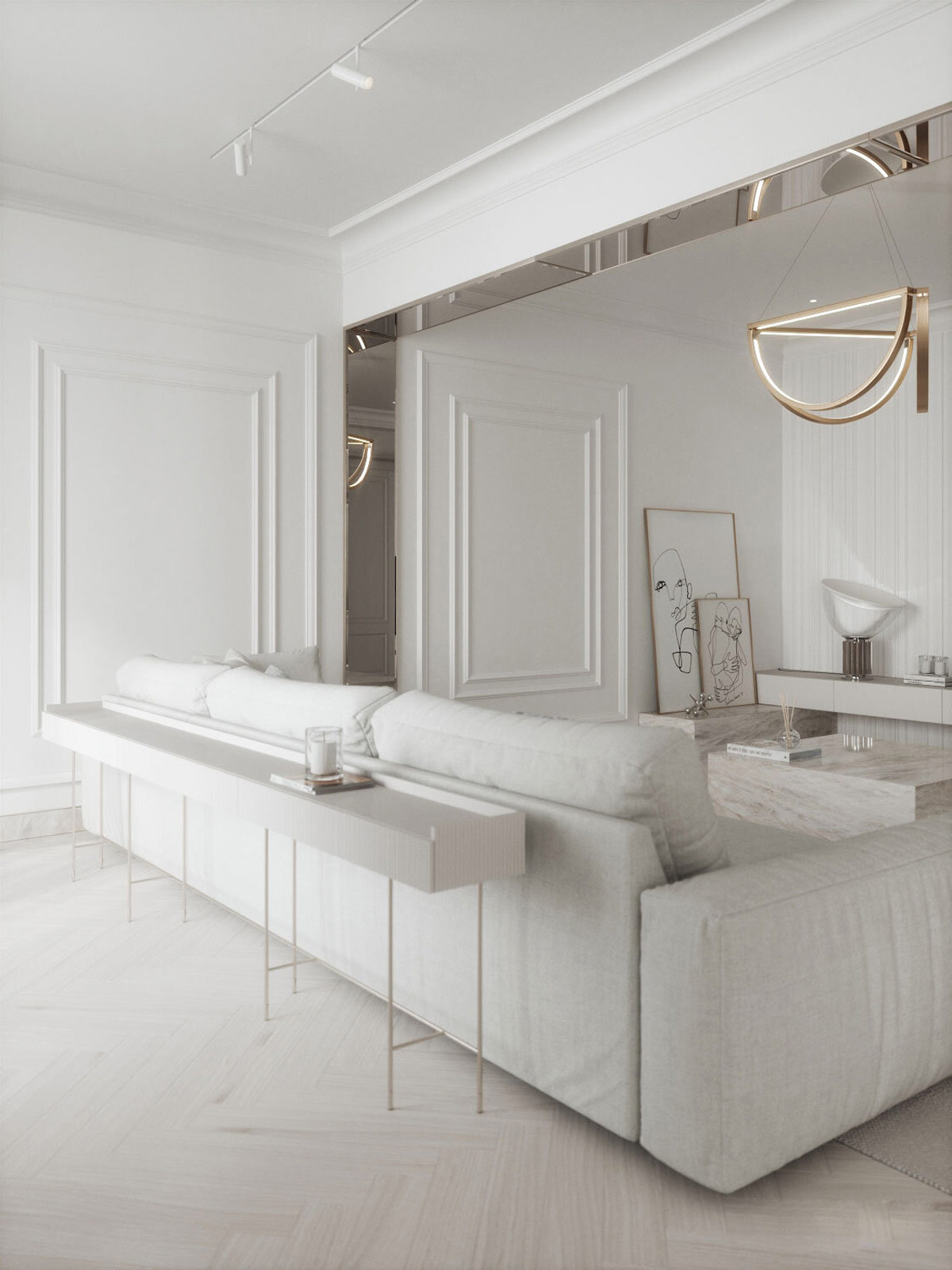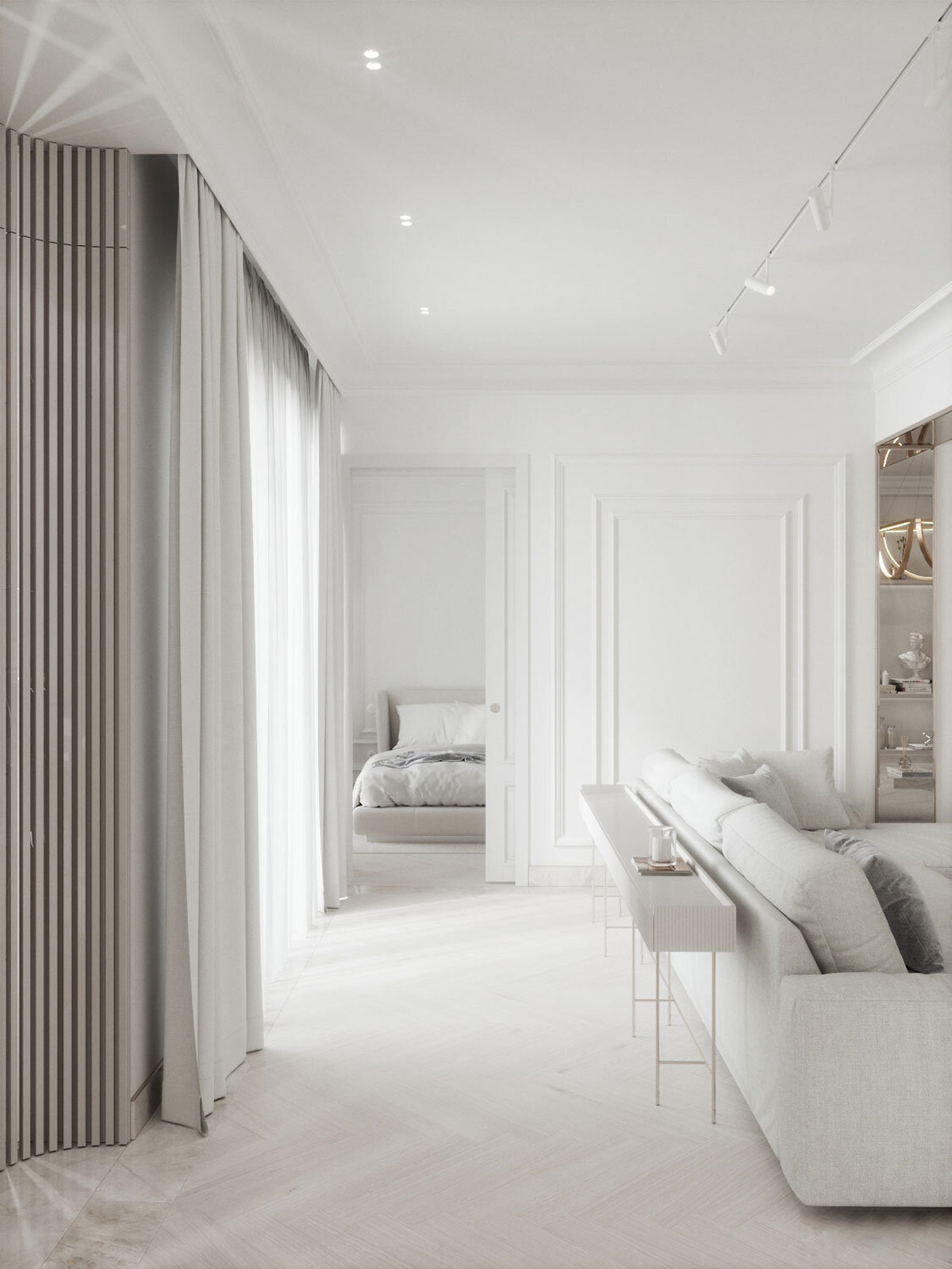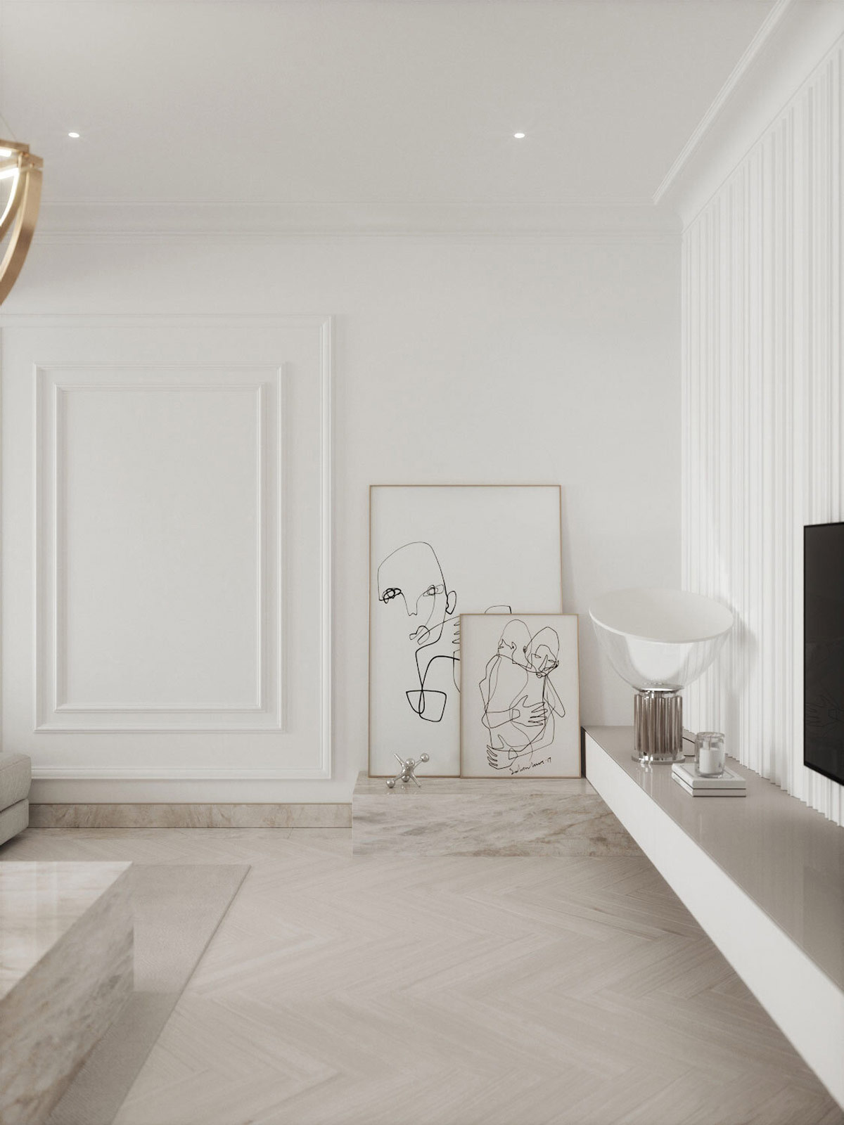 同心面板成型為純白色墻壁增添了大面積的趣味,同時(shí)還帶有一絲新古典主義的優(yōu)雅。