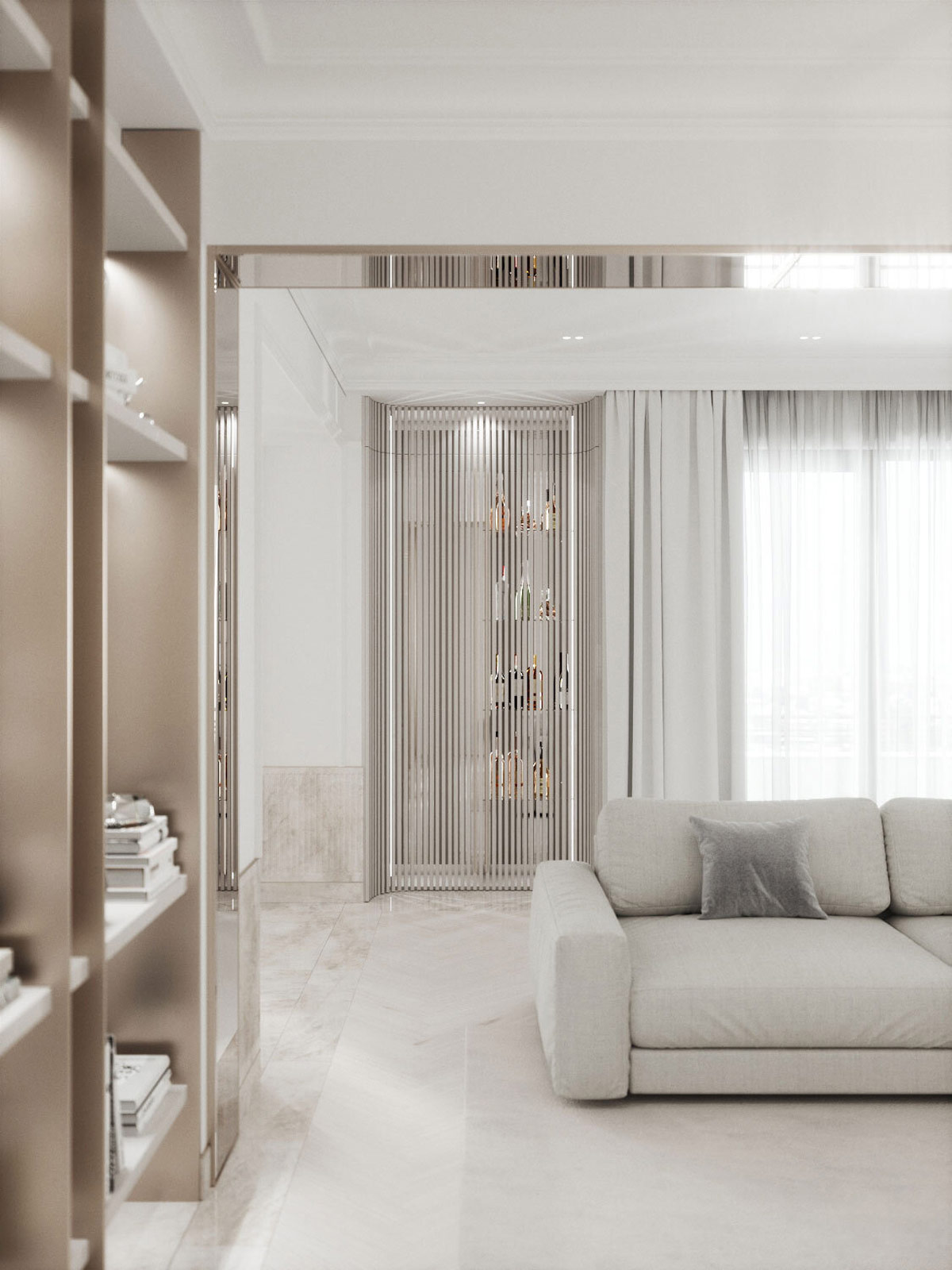 在這里,我們可以看到細(xì)長的鏡面天花板如何在客廳周圍形成一個(gè)完整的拱形,垂直面板在每一側(cè)反射房間。
