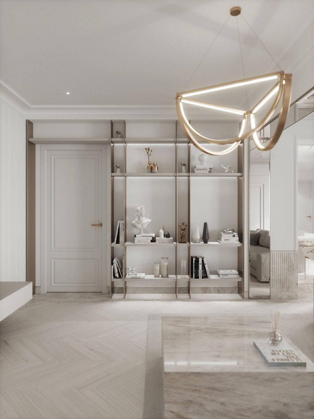 這個(gè)公寓項(xiàng)目采用輕盈奢華的白色內(nèi)飾,配有鏡子、金屬和光滑的大理石裝飾,是一個(gè)充滿精致裝飾品和引人注目的現(xiàn)代線條藝術(shù)的高端住宅。香檳金飾面為冰白色背景增添了一絲溫暖,而淺灰色的耳語則引入了微妙的陰影。奢華的浴室設(shè)計(jì)在美妙的粉紅色色調(diào)墻下進(jìn)入色彩領(lǐng)域,其中的甜美被沉重的黑色元素抵消。查找包含在家庭參觀結(jié)束時(shí)的完整平面圖。