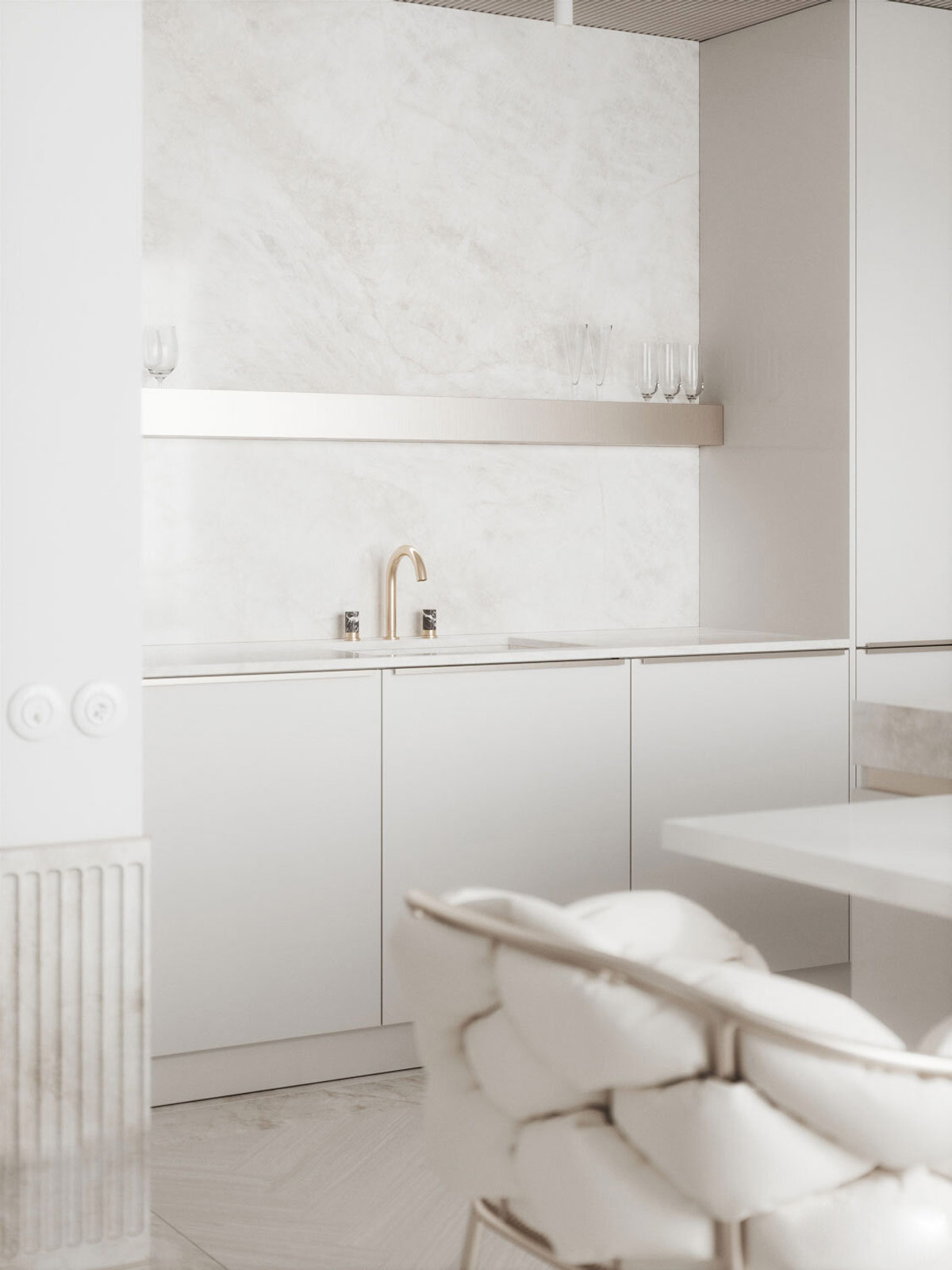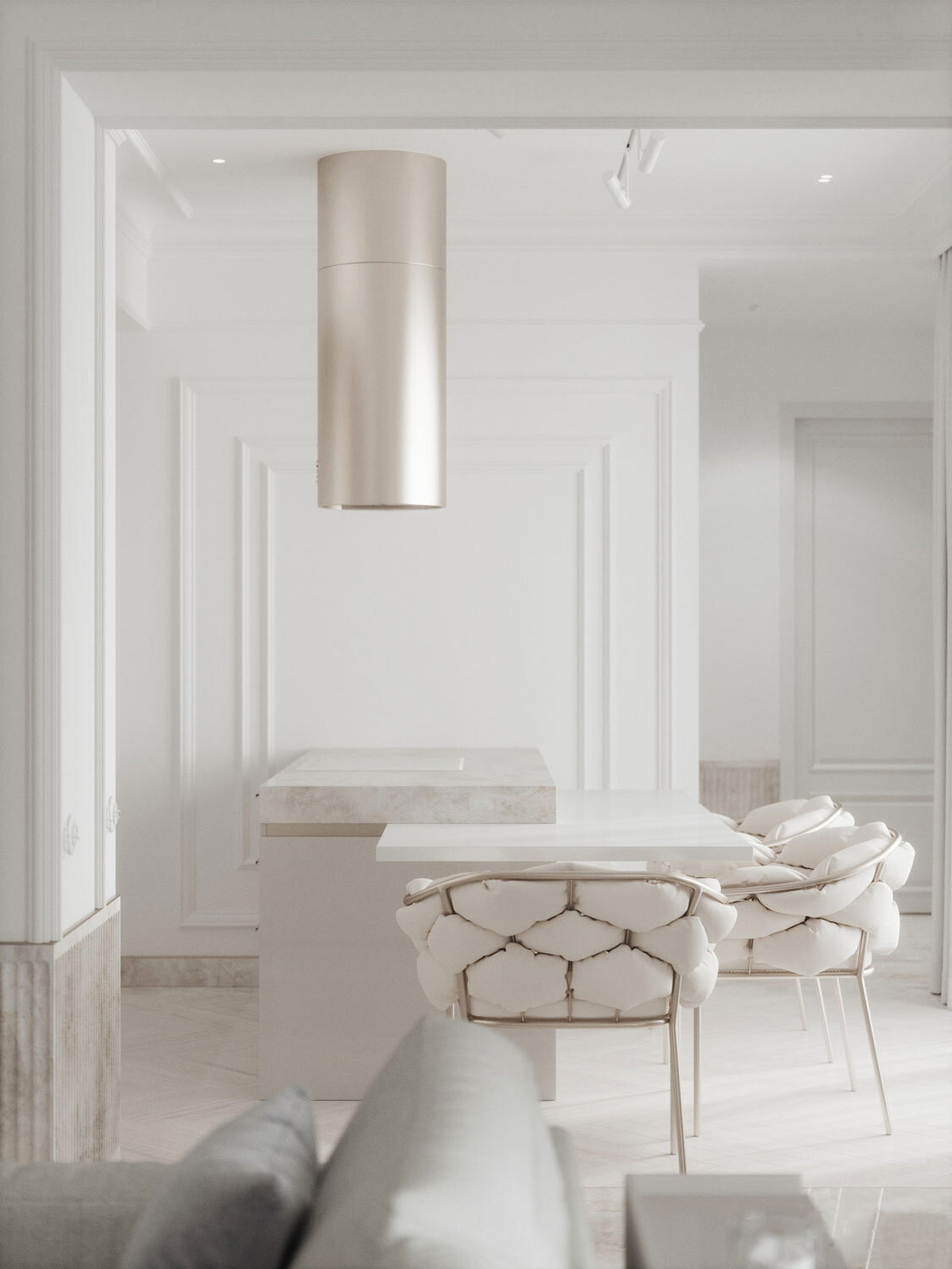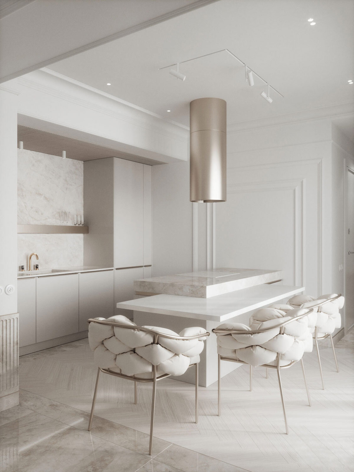 休息室直通豪華廚房空間,廚房島臺與美麗的懸臂餐桌表面融為一體。香檳金現(xiàn)代餐椅與奢華的白色絎縫靠背交織在一起。