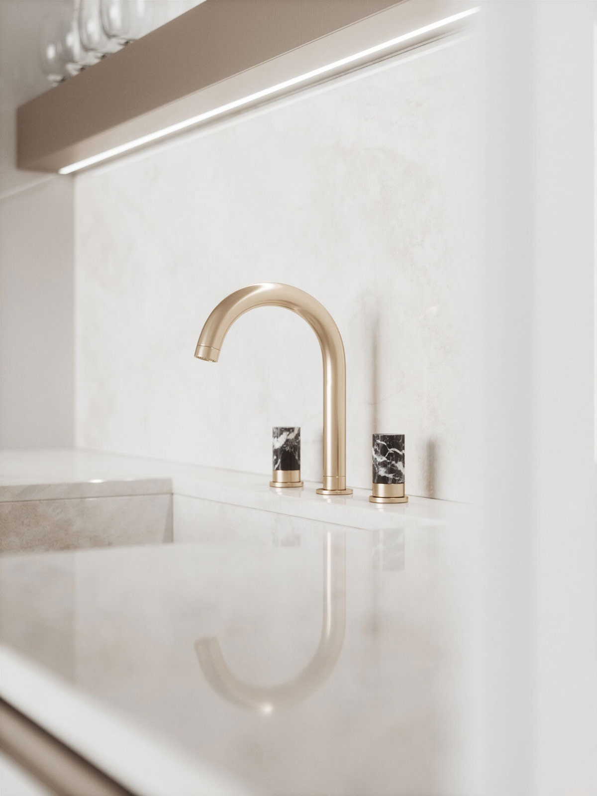 金色拉桿將迷你擱板靠近臉盆,用于放置必需的洗浴用品和芳香的蘆葦擴(kuò)散器。