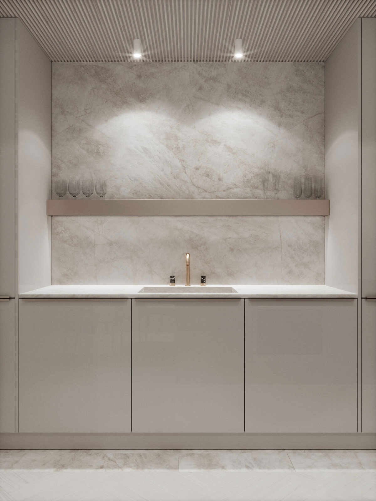 廚房水槽上方的酒杯儲物架表面閃爍著相配的香檳色光澤。