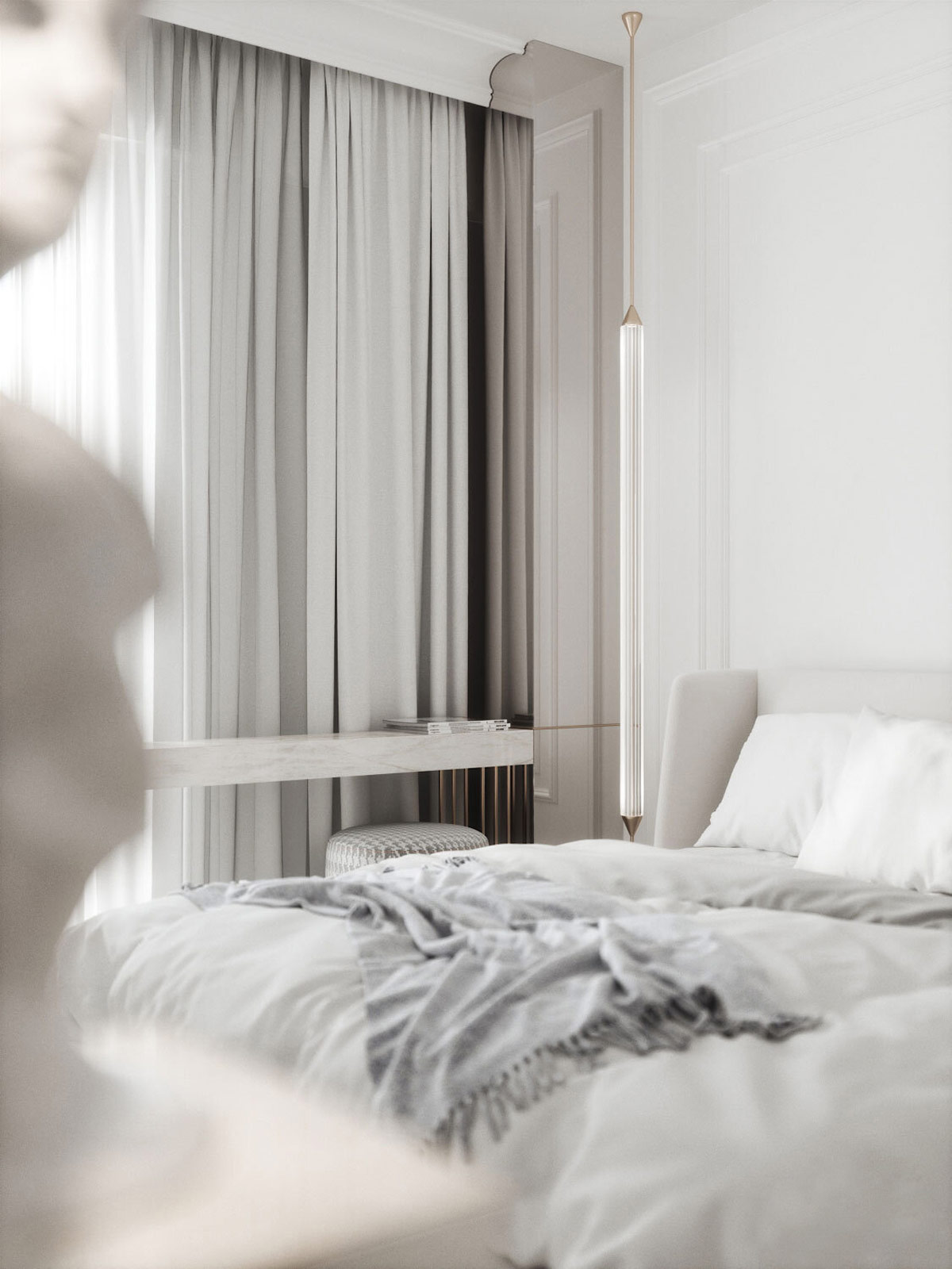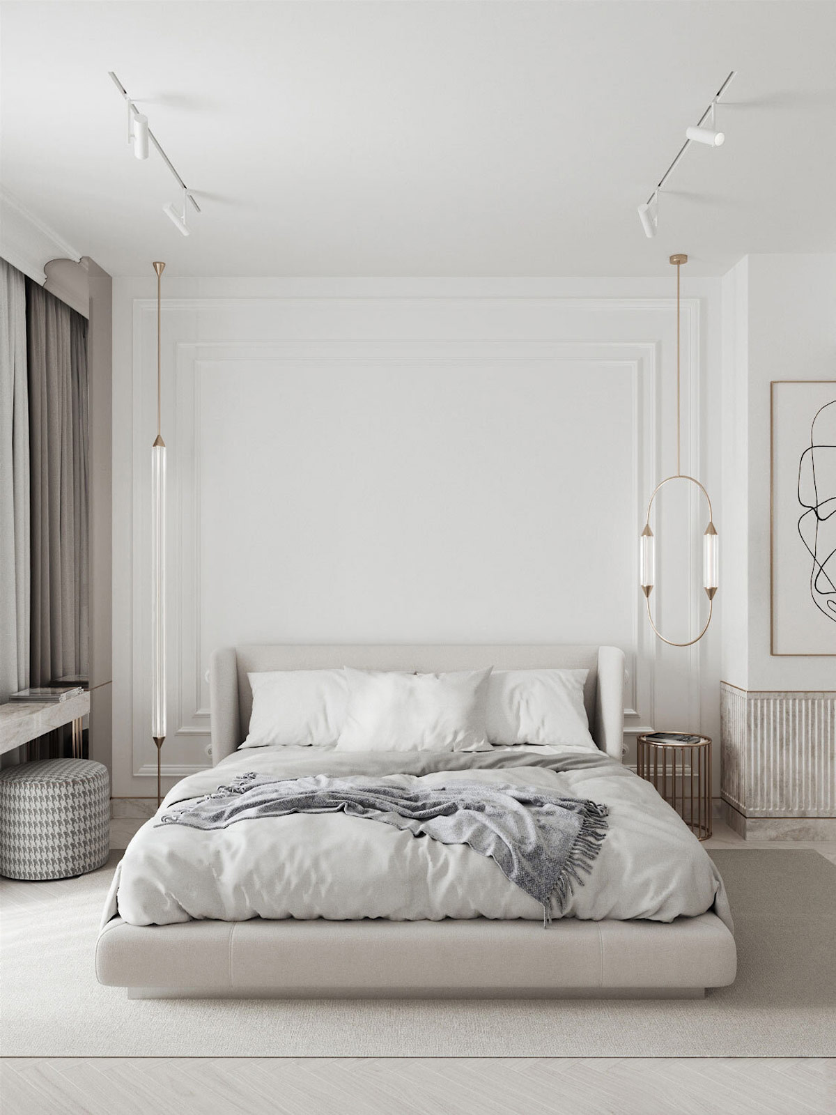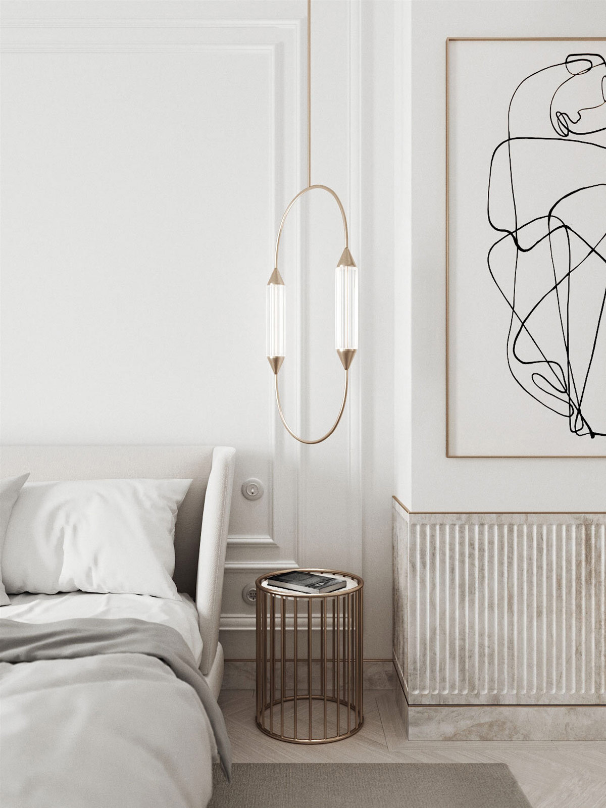 線條藝術(shù)在進(jìn)入臥室時(shí)形成一個(gè)焦點(diǎn),并由一盞低垂的床頭吊燈方便地照亮。