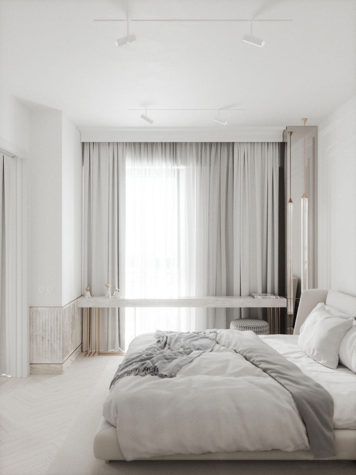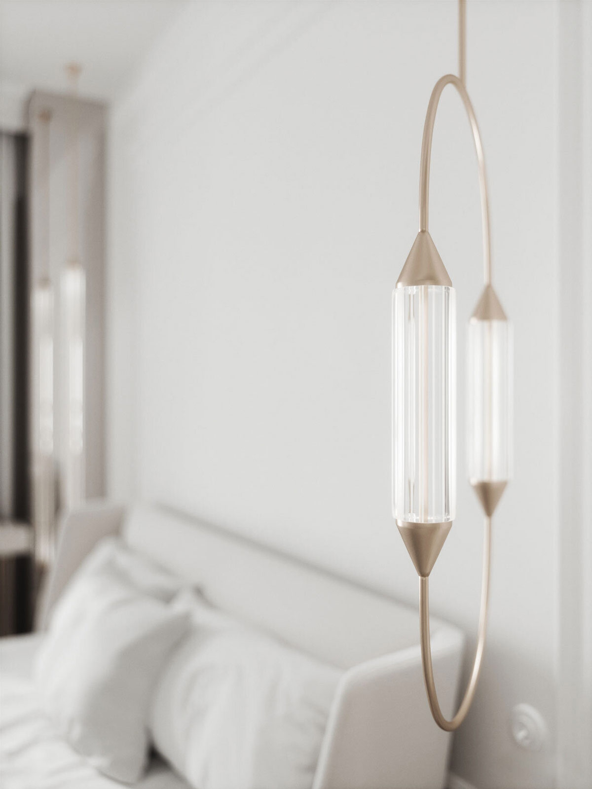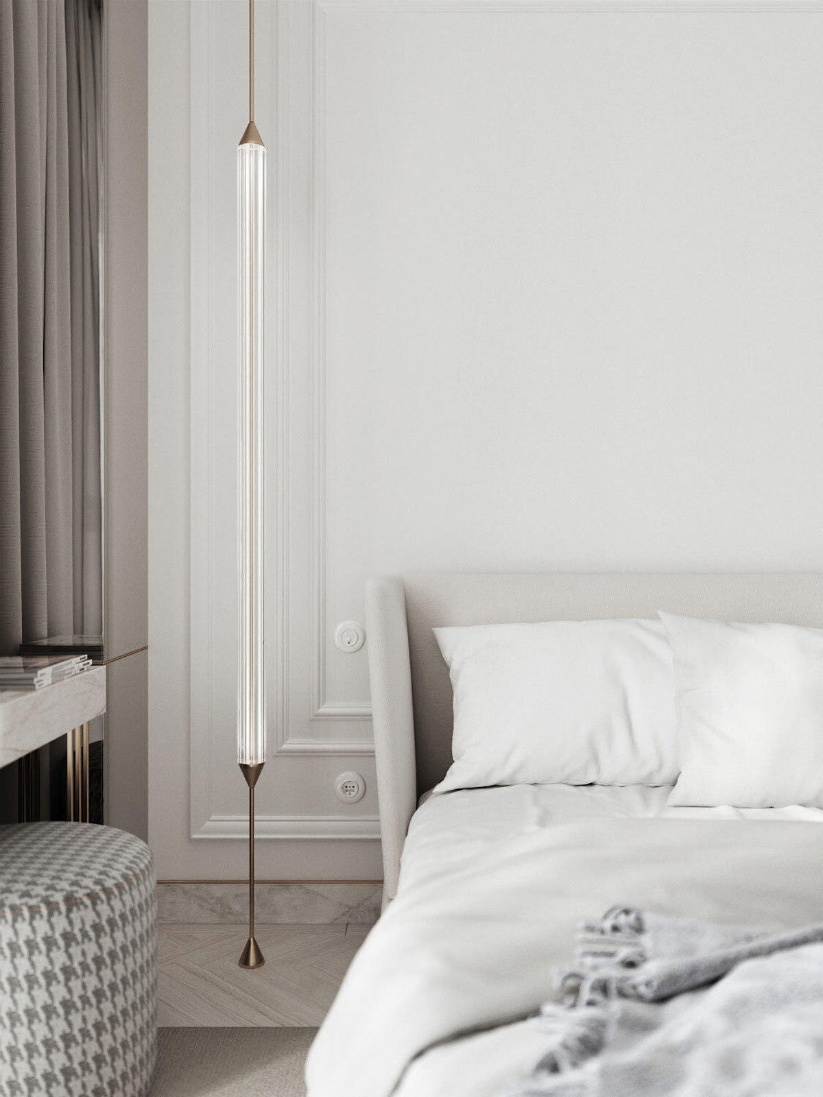 現(xiàn)代吊墜的香檳金色飾面和管狀玻璃固定裝置與床頭板另一側(cè)的落地?zé)粝鄥f(xié)調(diào),而不是傳統(tǒng)的孿生。