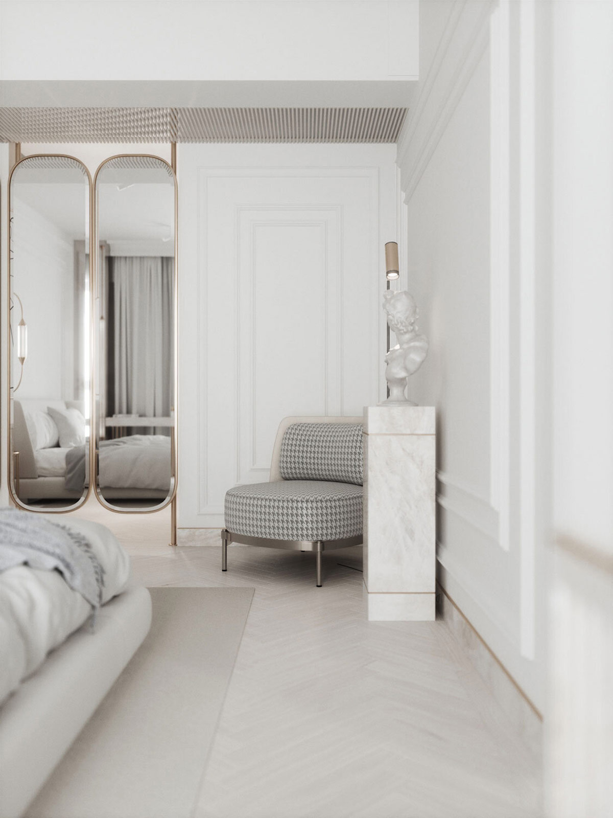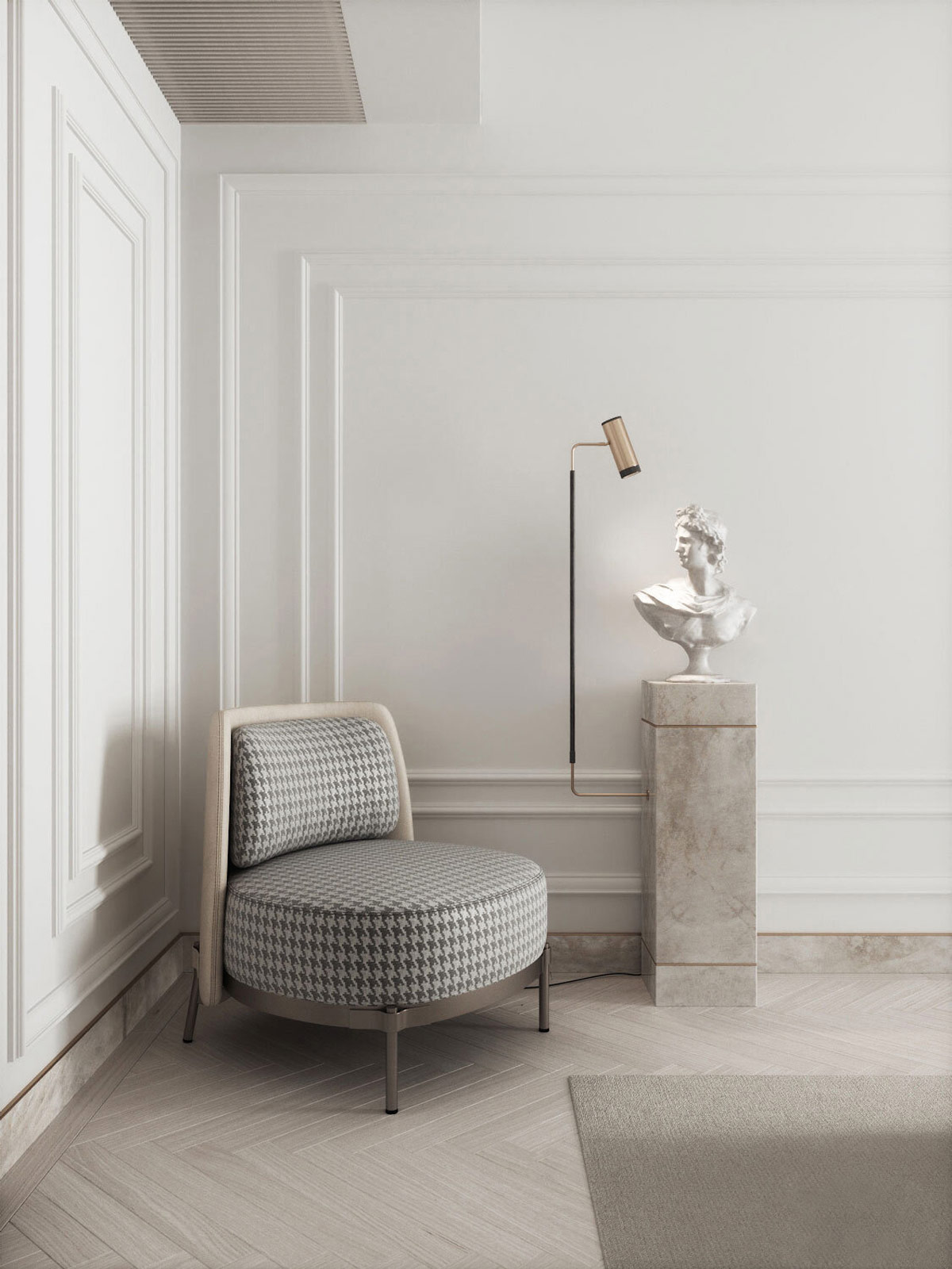 千鳥格軟墊臥室椅子與藝術(shù)展示相結(jié)合,獨(dú)特的自發(fā)光大理石底座展示了經(jīng)典的半身像。