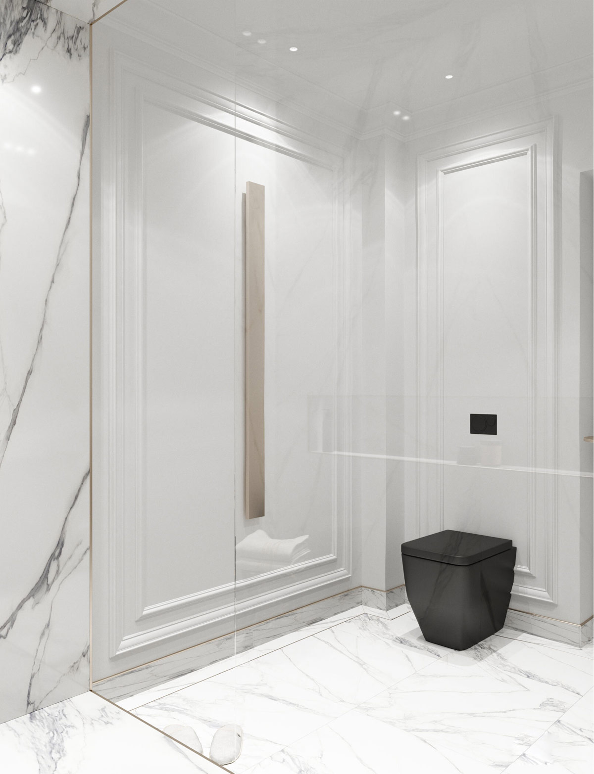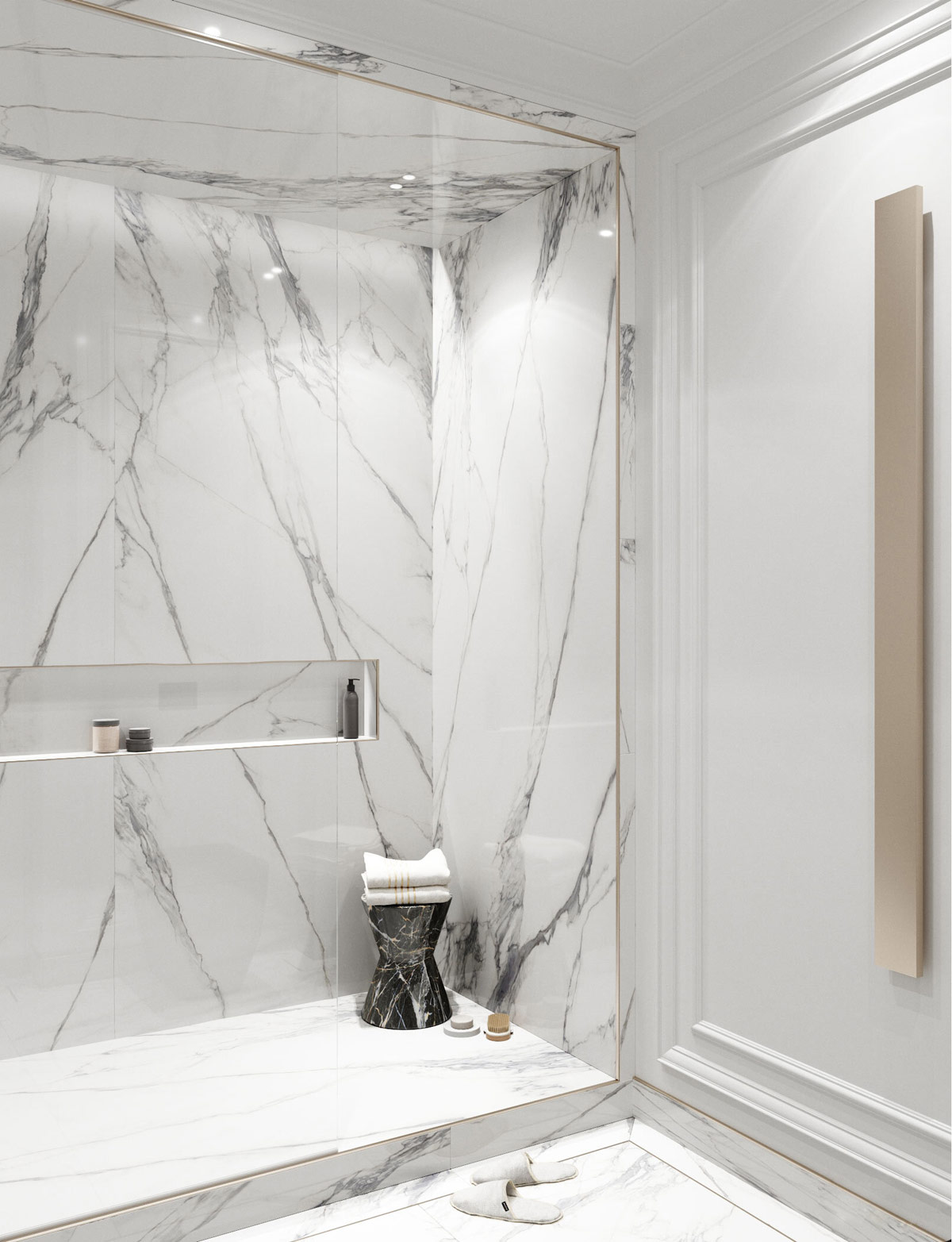 令人印象深刻的淋浴區(qū)包括一張對比鮮明的黑色大理石邊桌,用于放置干凈的白色毛巾。精美的金色飾邊與淋浴屏的邊緣相得益彰。