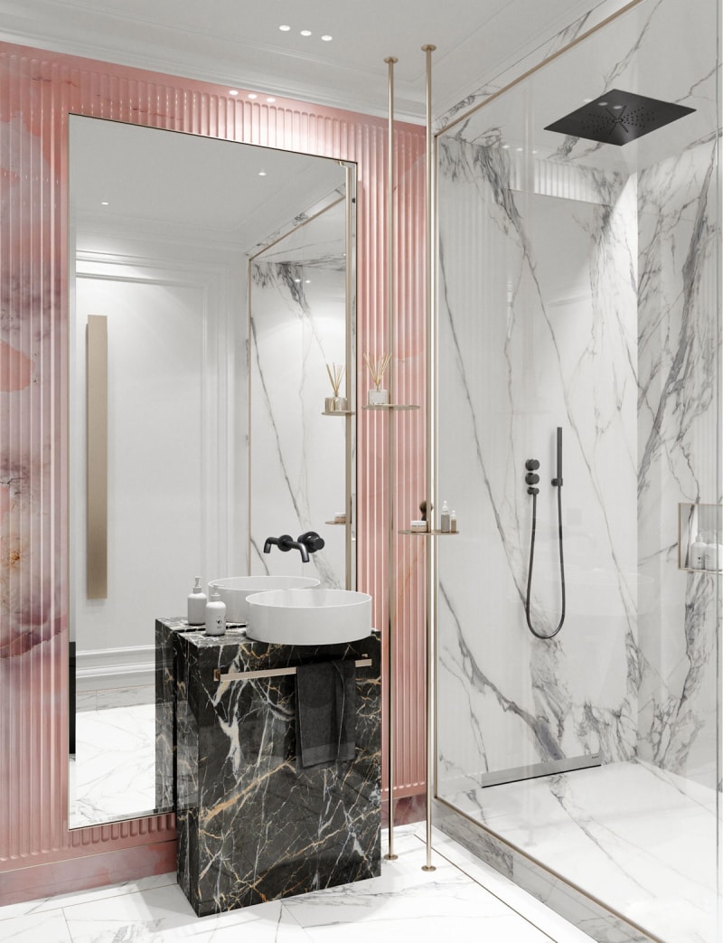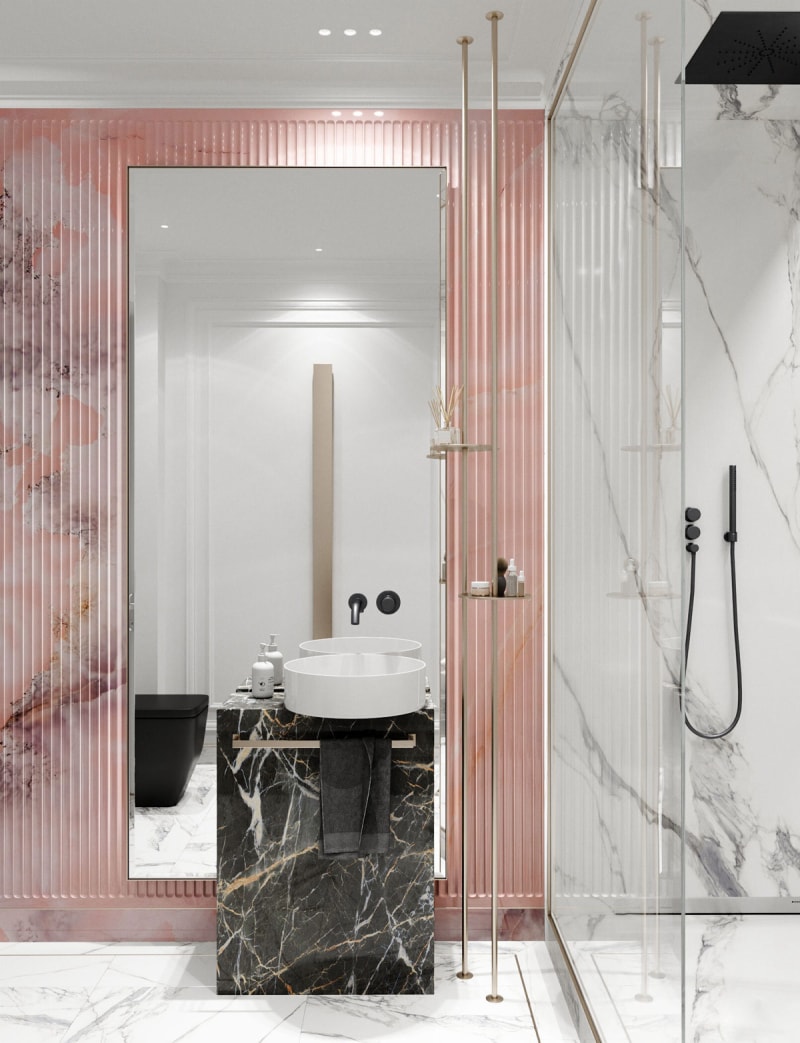 迷人的粉紅色特色墻將視線吸引到梳妝區(qū),堅(jiān)固的黑色大理石底座支撐著獨(dú)特的底座水槽設(shè)計(jì)。